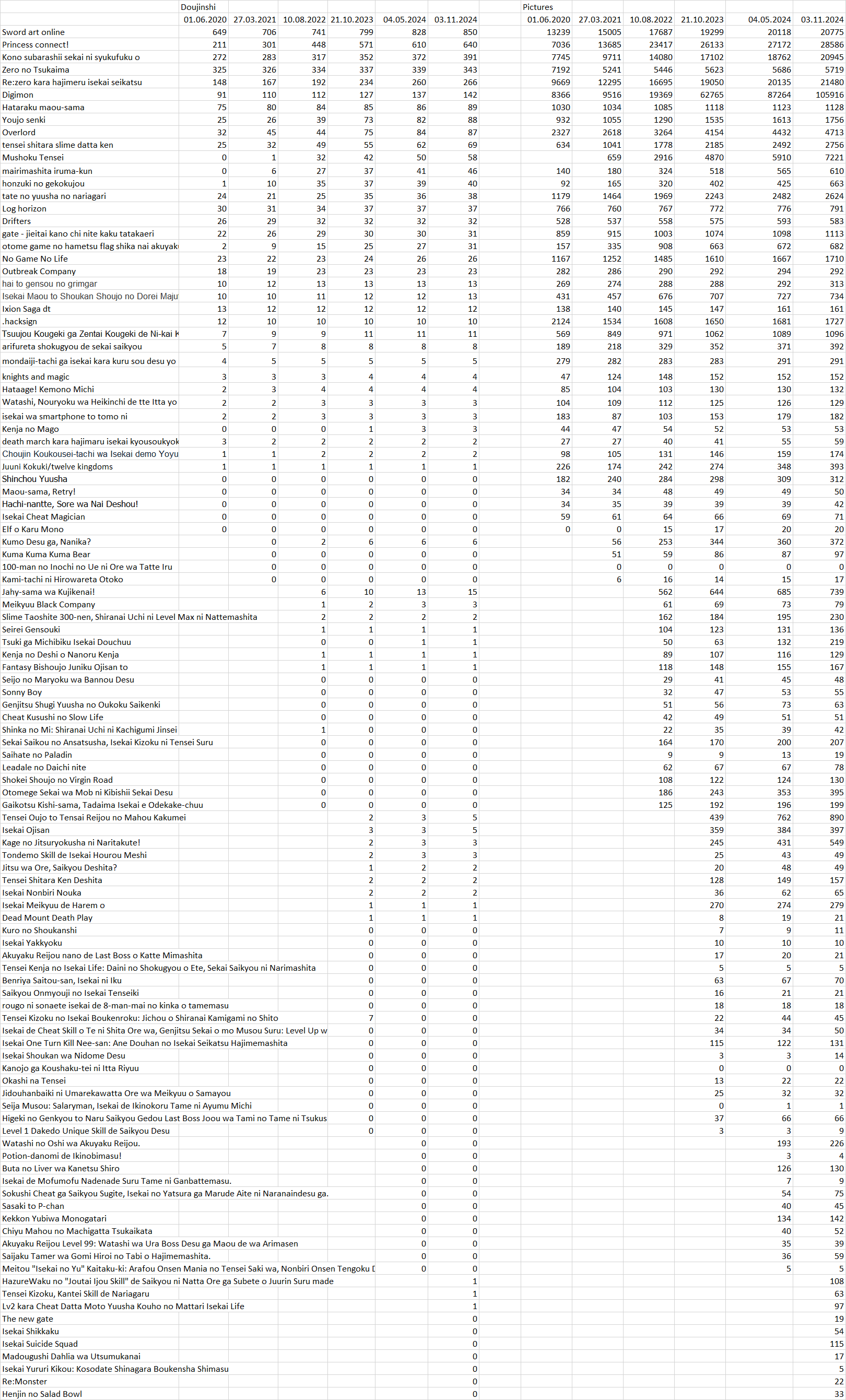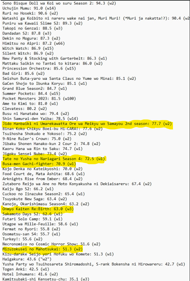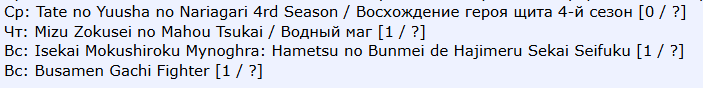 Исекай-онгоинги: Ср: Jidou Hanbaiki ni Umarekawatta Ore wa Meikyuu wo Samayou s2 / Перерождение в торговый автомат 2-й сезон [1 / ?] Ср: Tate no Yuusha no Nariagari 4rd Season / Восхождение героя щита 4-й сезон [0 / ?] Чт: Mizu Zokusei no Mahou Tsukai / Водный маг [1 / ?] Вс: Isekai Mokushiroku Mynoghra: Hametsu no Bunmei de Hajimeru Sekai Seifuku [1 / ?] Вс: Busamen Gachi Fighter [1 / ?]