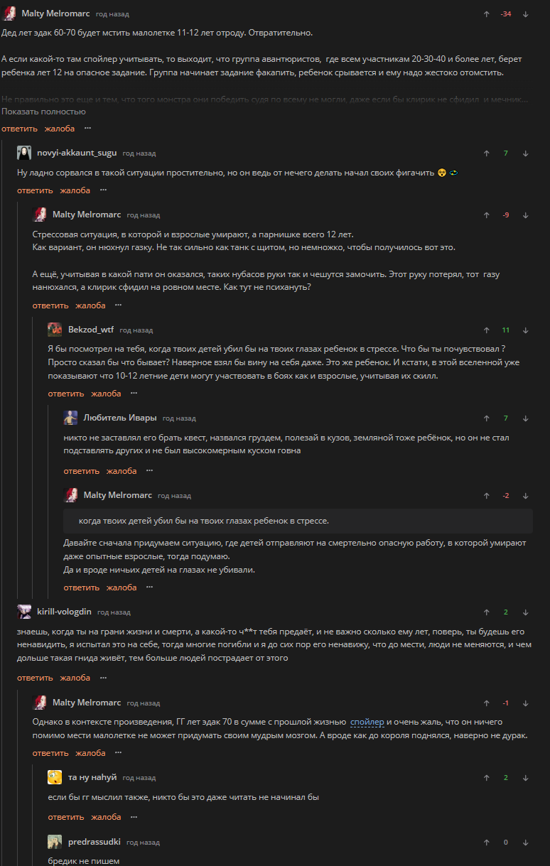 Ну а дальше они пошли в данж, взяли пацана реальных 12 лет отроду, зафидили, пацан психанул, за что 70 летний в душе ГГ поклялся ему жестоко отомстить и судя по коментам он это сделал.