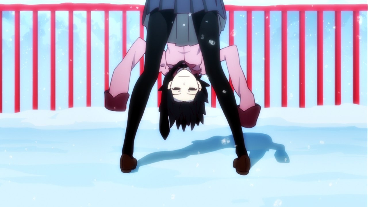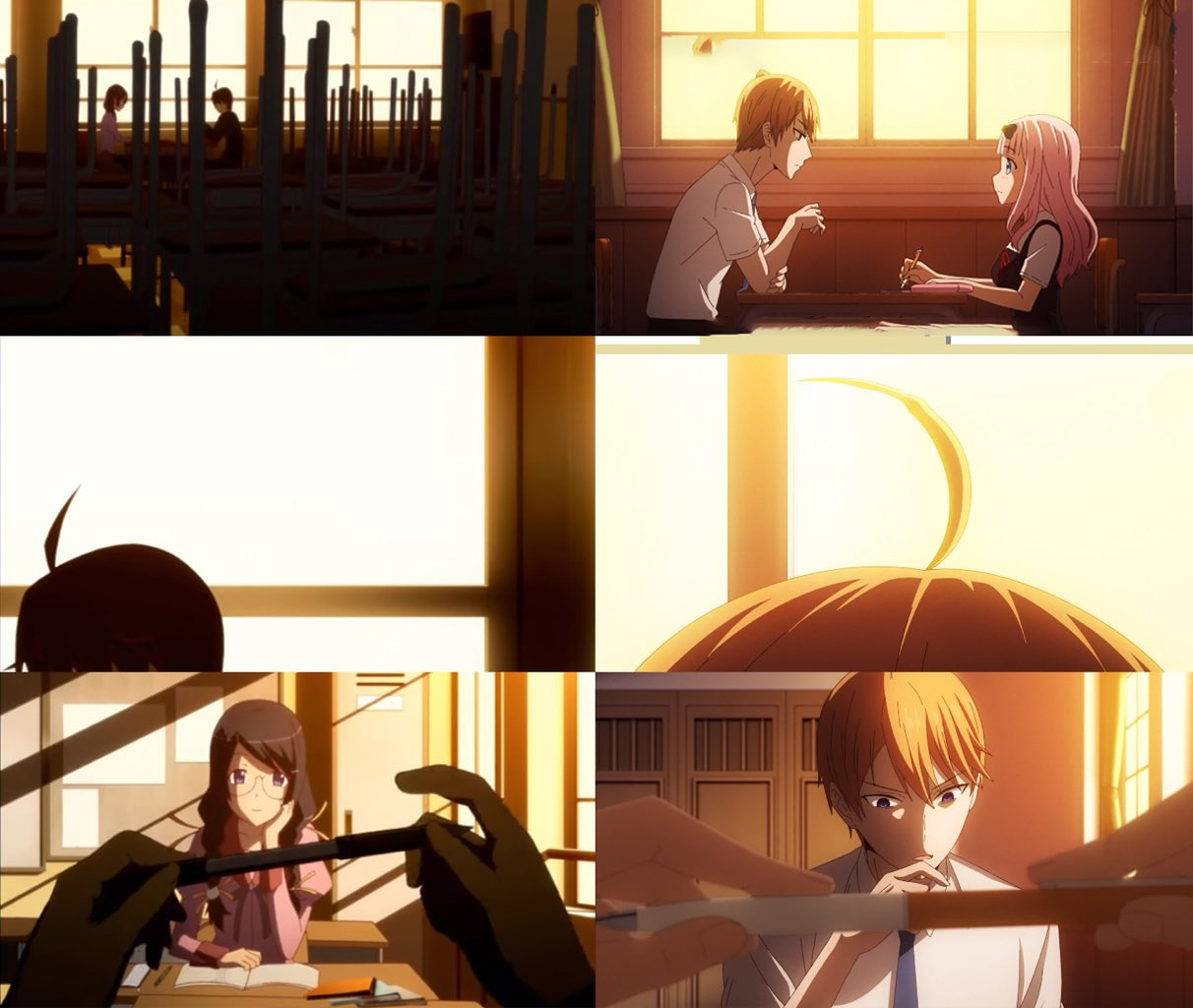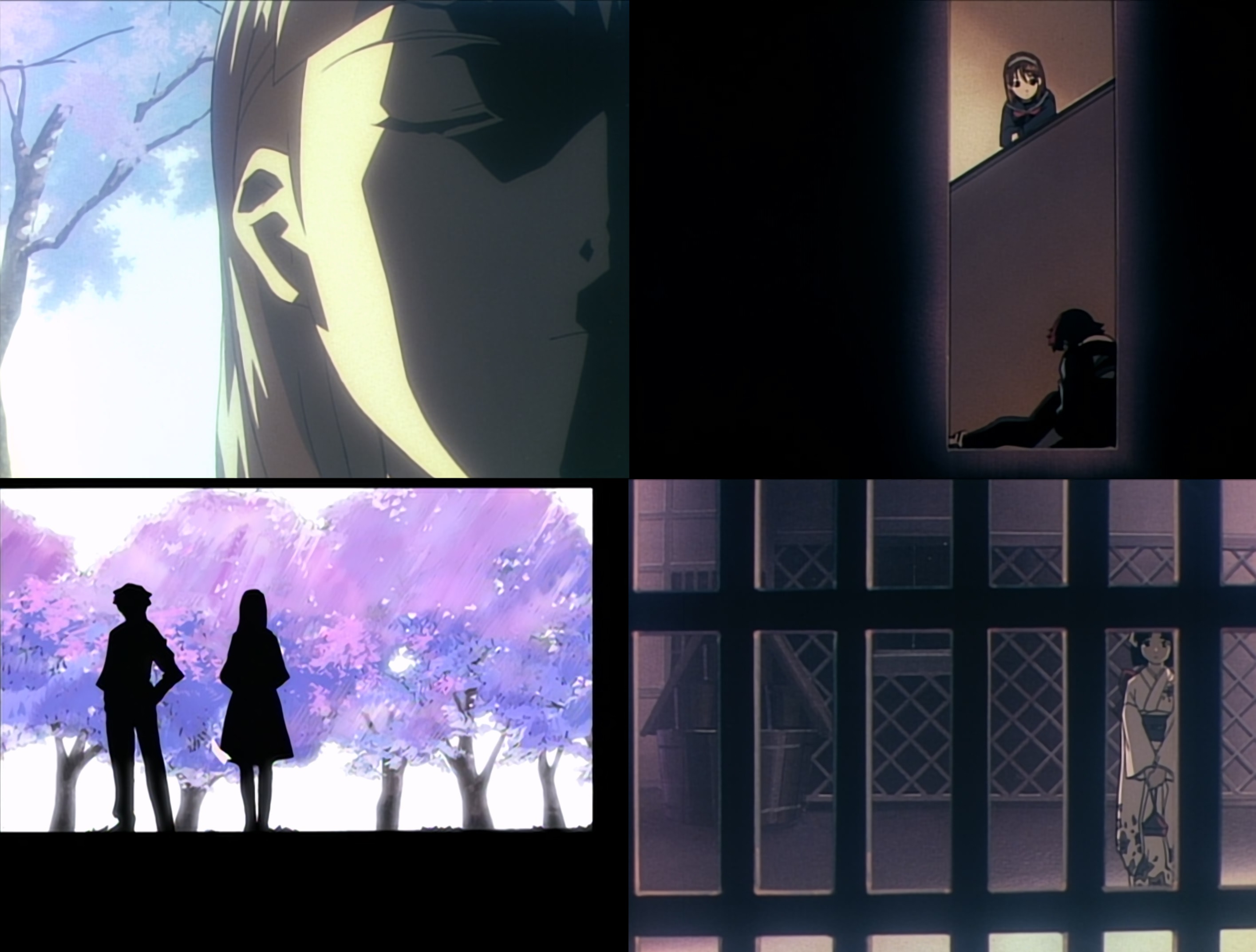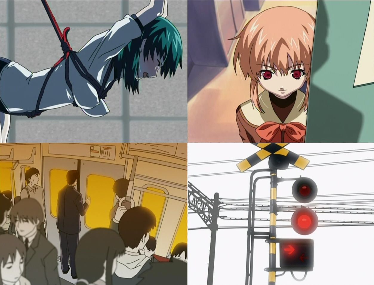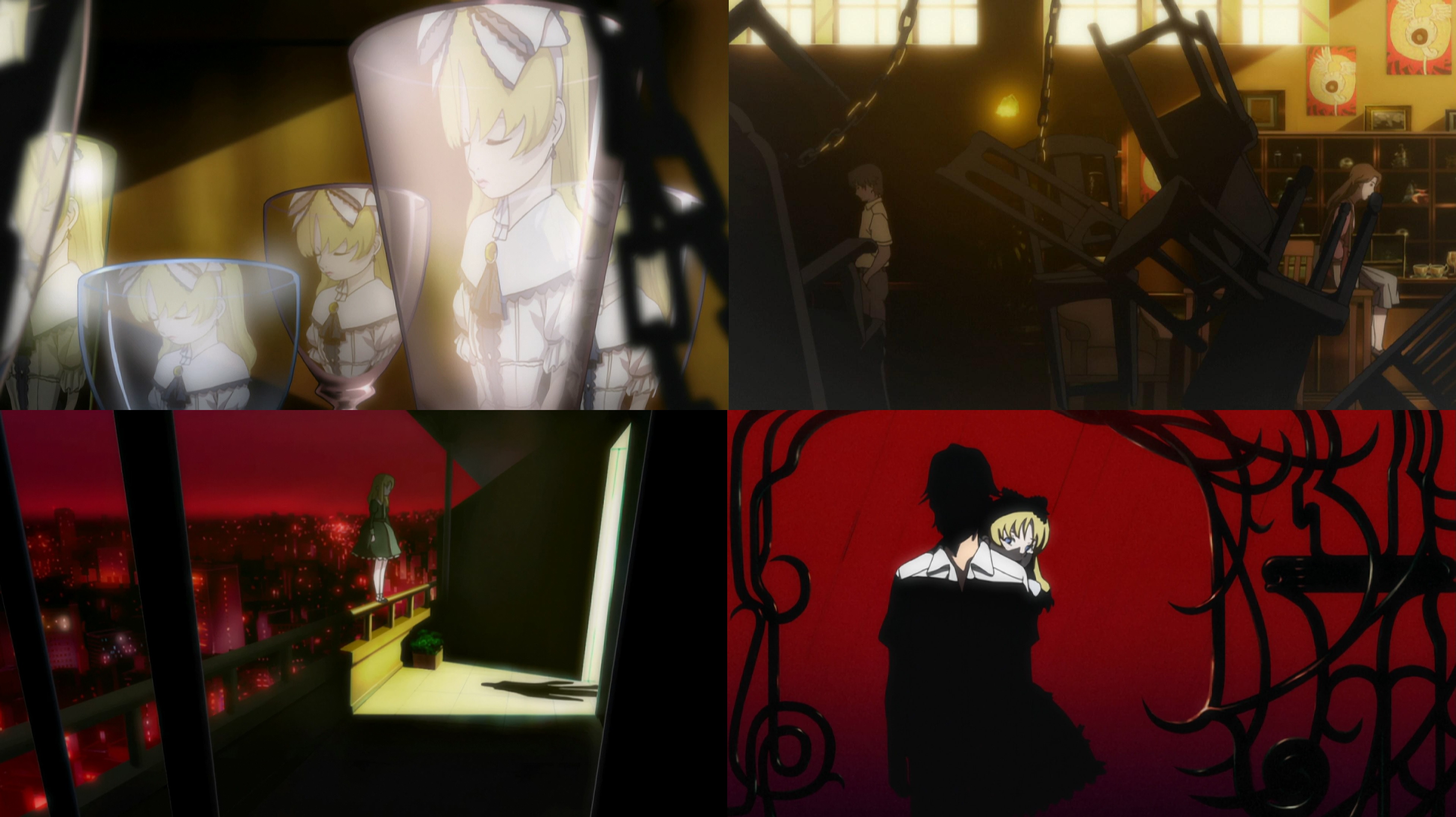 И да, кстати о Сакура трик - одним из тех бывших шафтовцев, которых Ишикура привлек, был Omata Shinichi, так же известный как Мамору Хатакэяма. Он уже сам потом режиссировал Shouwa Genroku Rakugo Shinjuu, Кагую-сама, овашки и мувик черного дворецкого и недавний Undead Girl Murder Farce для которой опять таки пригласил сразу кучку шафтовцев, в частности того же уже много раз упомянутого Такеучи и Такаши Кавабату. Вот Андед гёрл наиболее потенциально интересна в этом плане, но сам еще не добрался, так что с уверенностью не скажу. Хотя в той же Кагуе тоже многое можно заметить характерного и я не про референсы на гатари, а про комедийный тайминг и лейауты, просто не так сильно это все в глаза бросается. Ну и раз уж упомянул Кавабату - он тоже такой шафтовец, много работающий вне шафта, хоть никогда со студией и не рвавший. Из самостоятельных его работ есть только Hidan no Aria AA - я не смотрел и не слышал ничего или не запомнил, но он вообще в этом вот около-шафтовском кругу находится и его часто зовут на тайтлы над которыми другие шафтовцы работают или которые как то каким то боком к этому стилю имеют отношение, так что если посмотреть его работы - там много интересного можно найти. В первую очередь я бы упомянул Shoushimin Series. Интересный тайтл, его, конечно, нельзя отнести к "шафтовским", на первый взгляд даже может показаться что то, как он имеет дело с этой диалого-ориентированной психологической историей - прямо противоположен гатаривскому, с упором на гиперреалистический визуал, вместо авангарда, но в основе очень много сходств - использование негативного пространства, "плоская" композиция дальних планов, жесткий блокинг, перекрытый передний план, отражения и т.п. Не прямое влияние, а скорее одни и те же истоки.