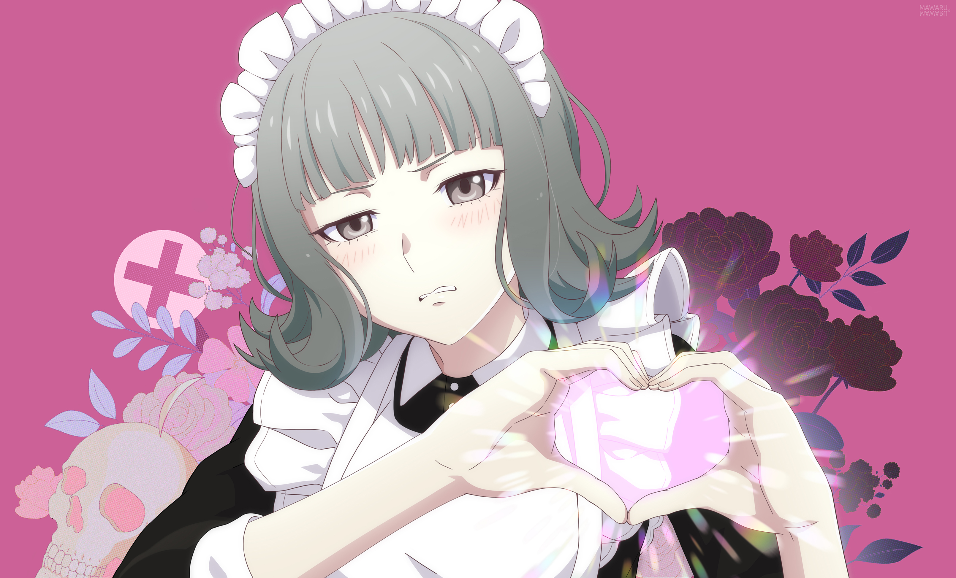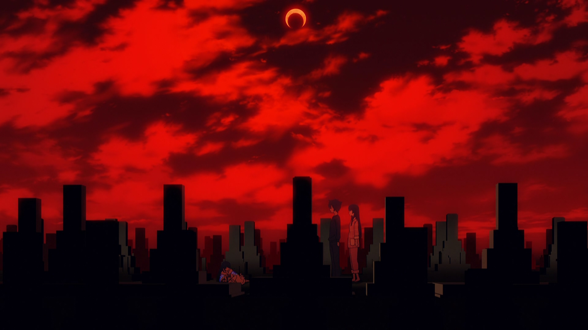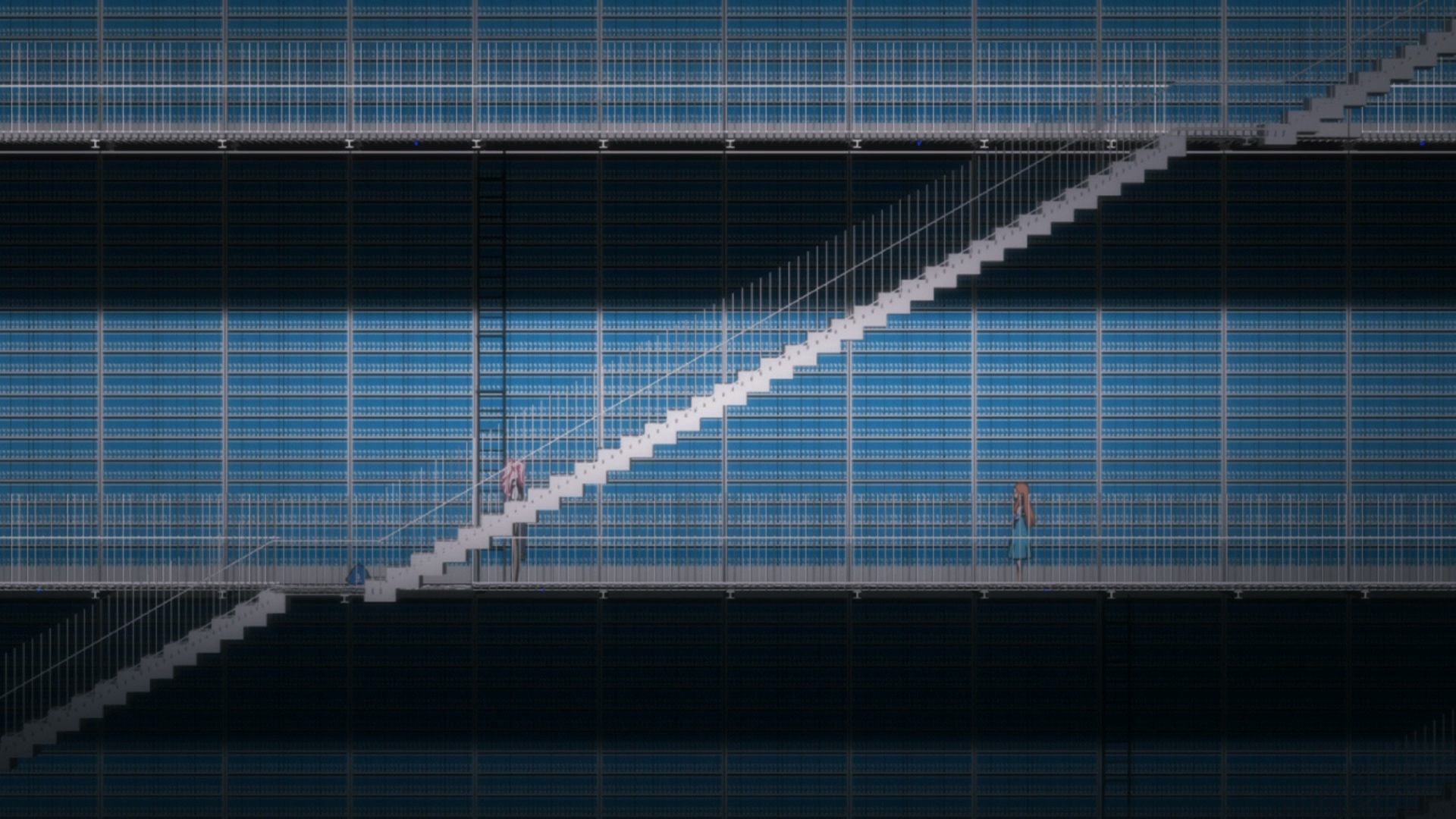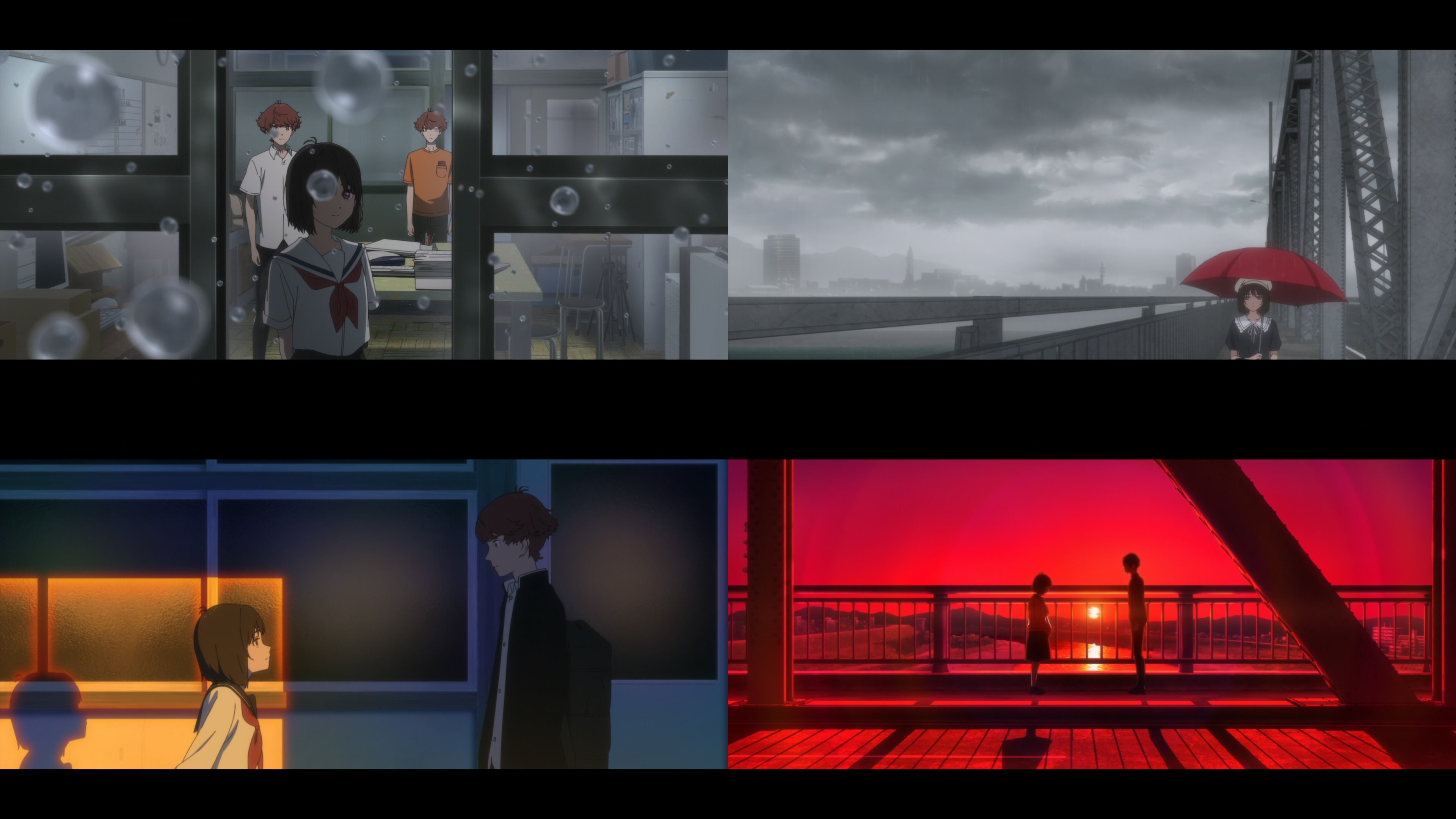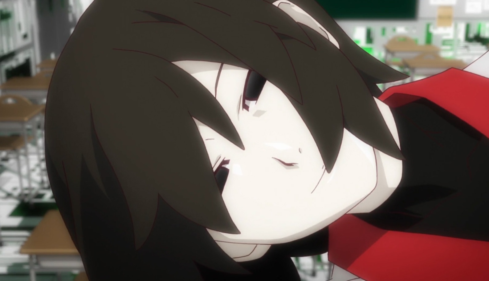 И да, кстати о Сакура трик - одним из тех бывших шафтовцев, которых Ишикура привлек, был Omata Shinichi, так же известный как Мамору Хатакэяма. Он уже сам потом режиссировал Shouwa Genroku Rakugo Shinjuu, Кагую-сама, овашки и мувик черного дворецкого и недавний Undead Girl Murder Farce для которой опять таки пригласил сразу кучку шафтовцев, в частности того же уже много раз упомянутого Такеучи и Такаши Кавабату. Вот Андед гёрл наиболее потенциально интересна в этом плане, но сам еще не добрался, так что с уверенностью не скажу. Хотя в той же Кагуе тоже многое можно заметить характерного и я не про референсы на гатари, а про комедийный тайминг и лейауты, просто не так сильно это все в глаза бросается. Ну и раз уж упомянул Кавабату - он тоже такой шафтовец, много работающий вне шафта, хоть никогда со студией и не рвавший. Из самостоятельных его работ есть только Hidan no Aria AA - я не смотрел и не слышал ничего или не запомнил, но он вообще в этом вот около-шафтовском кругу находится и его часто зовут на тайтлы над которыми другие шафтовцы работают или которые как то каким то боком к этому стилю имеют отношение, так что если посмотреть его работы - там много интересного можно найти. В первую очередь я бы упомянул Shoushimin Series. Интересный тайтл, его, конечно, нельзя отнести к "шафтовским", на первый взгляд даже может показаться что то, как он имеет дело с этой диалого-ориентированной психологической историей - прямо противоположен гатаривскому, с упором на гиперреалистический визуал, вместо авангарда, но в основе очень много сходств - использование негативного пространства, "плоская" композиция дальних планов, жесткий блокинг, перекрытый передний план, отражения и т.п. Не прямое влияние, а скорее одни и те же истоки.