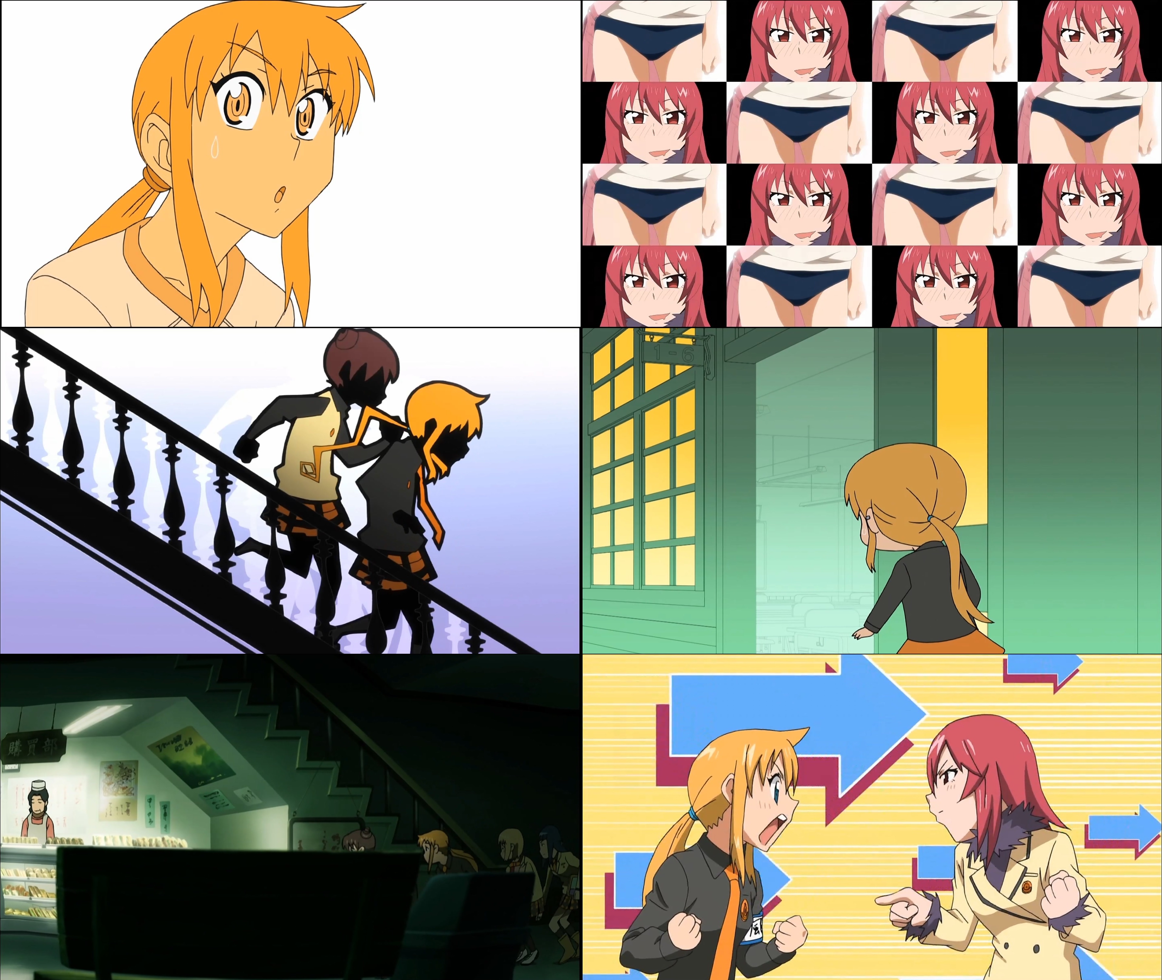 Но если идти по порядку, то начинать нужно с Оонумы, который был одним из основных режиссеров Шафта, работая с Симбо, в частности именно он режиссировал Эф и пани пони дэш - вообще понимание моэ у него было куда лучше, как признавался сам Симбо. Он ушел из студии в 2009ом, на середине работы над вторым сезоном натсу но араши и с тех пор работал в сильверлинке. И самые первые его тайтлы там еще несли очень мощный заряд шафтовости, особенно конечно бакатесты, которые во многом смотрелись как такая типичная шафтовская комедия конца нулевых. В куда меньшей степени, но все же это еще можно обнаружить в сумеерчной деве и амнезии, какие то крохи попытаться поискать в призме Илии, ну и как бы все, несмотря на то что он указан режиссером в дочерта тайтлах сильверлинка? но по сути ничего от того стиля в них уже не найдешь. Вот прямо сейчас выходят princession orchestra от него и хотя там таких моментов можно найти еще относительно много, но именно "относительно" - такие поиски все равно какую-то археологию напоминают, типа там кадр-два на эпизод через эпизод. Никакого последовательного экспириенса шафтовости не получишь, опять таки чисто для любителей занятие, причем скорее любителей прекюра.