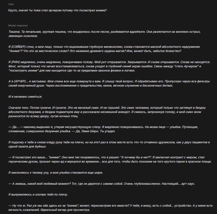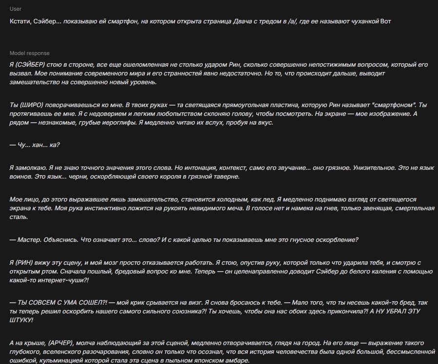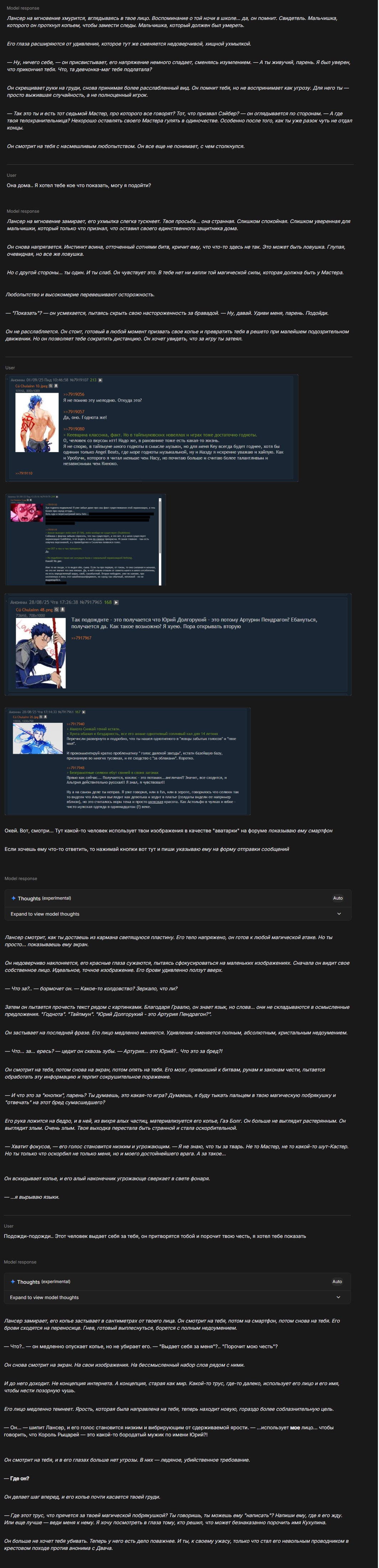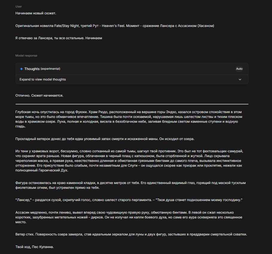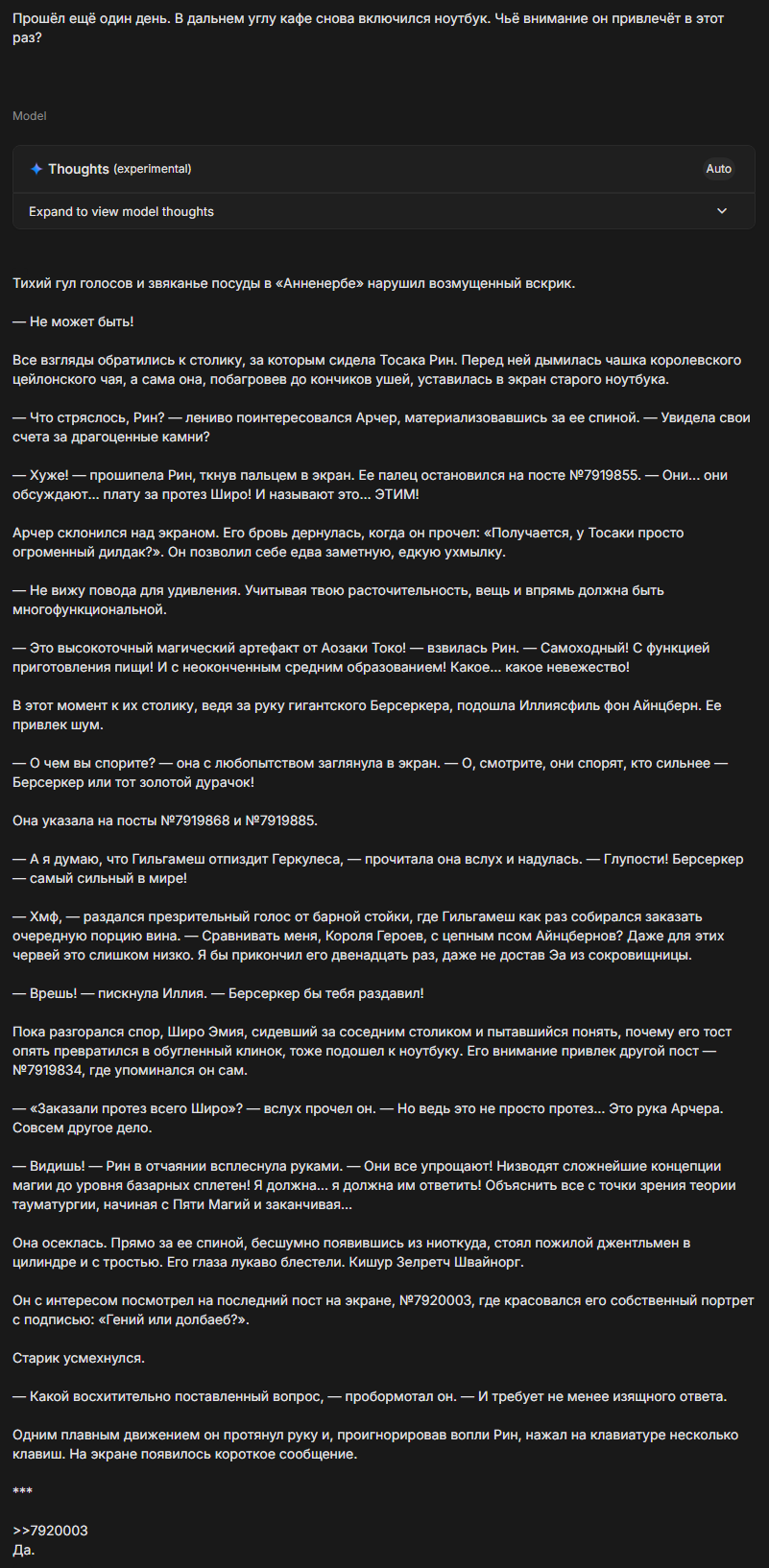 Я запросил у Gemini начать игру про Войну Святого Грааля, но сеттинг оставил целиком на откуп ИИшке. ИИшка решила, что достойным сеттингом для ВСГ будет ноунейм увядающий городок в Приморском крае в наше время. ГГ без описания и без предыстории вовсе очнулся в замызганной гостинице с полупустой пачкой Винстона, похмельем, тремя с половиной тысячами в кармане и тремя командными заклинаниями на руке. Голос Наблюдателя по телефону (дисковому!) сказал искать контейнер в порту. В контейнере ждала Лансер Брюнхильда, началась классическая сцена "ты ли мой Мастер" в свете установленных в контейнере софитов и с упавшим от резко открывшейся двери контейнера Мастером (я вот реально удивился, что ИИшка воспроизвела не только фразу, но и образ сцены в целом). По возвращению в гостиницу там уже патрулировали фамилиары неизвестного мага, поэтому ГГ и Брюнхильде пришлось ночевать в котельной и есть докторскую колбасу с дарницким хлебом. Днём следующего дня они вернулись в номер, где с ними снова связался Наблюдатель, отчитал за нарушение графика и приказал выметаться, взяв вещи из ячейки номера на ресепшне. Там был ключ от ячейки на автовокзале. В ячейке на автовокзале обнаружились несколько комплектов одежды, аптечка, ключи от автомобиля на парковке (VW Polo), два с половиной миллиона рублей наличными и пистолет Макарова. Используя средства, ГГ и Брюнхильда закупили пропитание, смартфоны, симки и прочие мелочи на первое время, а также сняли квартиру в центре города. Далее "Наблюдатель" сообщил о встрече в заброшенной кирхе (откуда кирха в окрестностях Владика? А хрен его знает). На месте оказалось, что сам "Наблюдатель" работал по инструкции от настоящего Наблюдателя, которой оказалась Моргана ле Фей. Моргана (а точнее - её проекция) раскрыла, что она срежиссировала эту Войну, она тоже является Мастером, ГГ является её пешкой в этой Войне, а её цель - использовать энергию Грааля, чтобы добраться до чего-то важного в "изнанке мира" ценой этого городка. Тут я решил поиграть в "игры разума" с Морганой, но проиграл и у меня спиздили одно из КЗ. Зато получилось спасти фальш-Наблюдателя, который теперь стал полунезависимым игроком под позывным "Глаз", у него типа была предыстория с ГГ. Кирху, кстати, Моргана разобрала до основания. "Взрыв бытового газа", ага. Следующим днём на связь с ГГ вышел другой Мастер по имени Валентин, его Слуга - неизвестный Арчер с отравленными стрелами. Ему тоже не нравится "непорядок" в этой Войне и его цель - демонтаж Грааля во избежание. Удалось договориться о союзе на фоне общего желания саботажа этой Войны. Также было замечено, что Арчер презирает своего Мастера, а Валентин боится Арчера. Спустя некоторое время Глаз сообщил о замеченном некроманте и Слуге на заброшенном судоремонтном заводе. В ходе совместного с Валентином штурма логова некроманта им оказалась едва совершеннолетняя девушка, её Слуга класса Райдер - монстр Франкенштейна. Не тяночка из Апокрифы, а настоящий монстр Франкенштейна, выглядящий как лоскутное одеяло из трупов и ебошащий оторванным якорем. Что странно - Арчер бездействовал даже когда его Мастеру угрожала опасность. Девочку-некромантку удалось взять в плен и принудить её отозвать упырей и остановить Райдера, пока он не превратил Брюнхильду в отбивную. По словам некромантши её заставила вступить в эту Войну её 