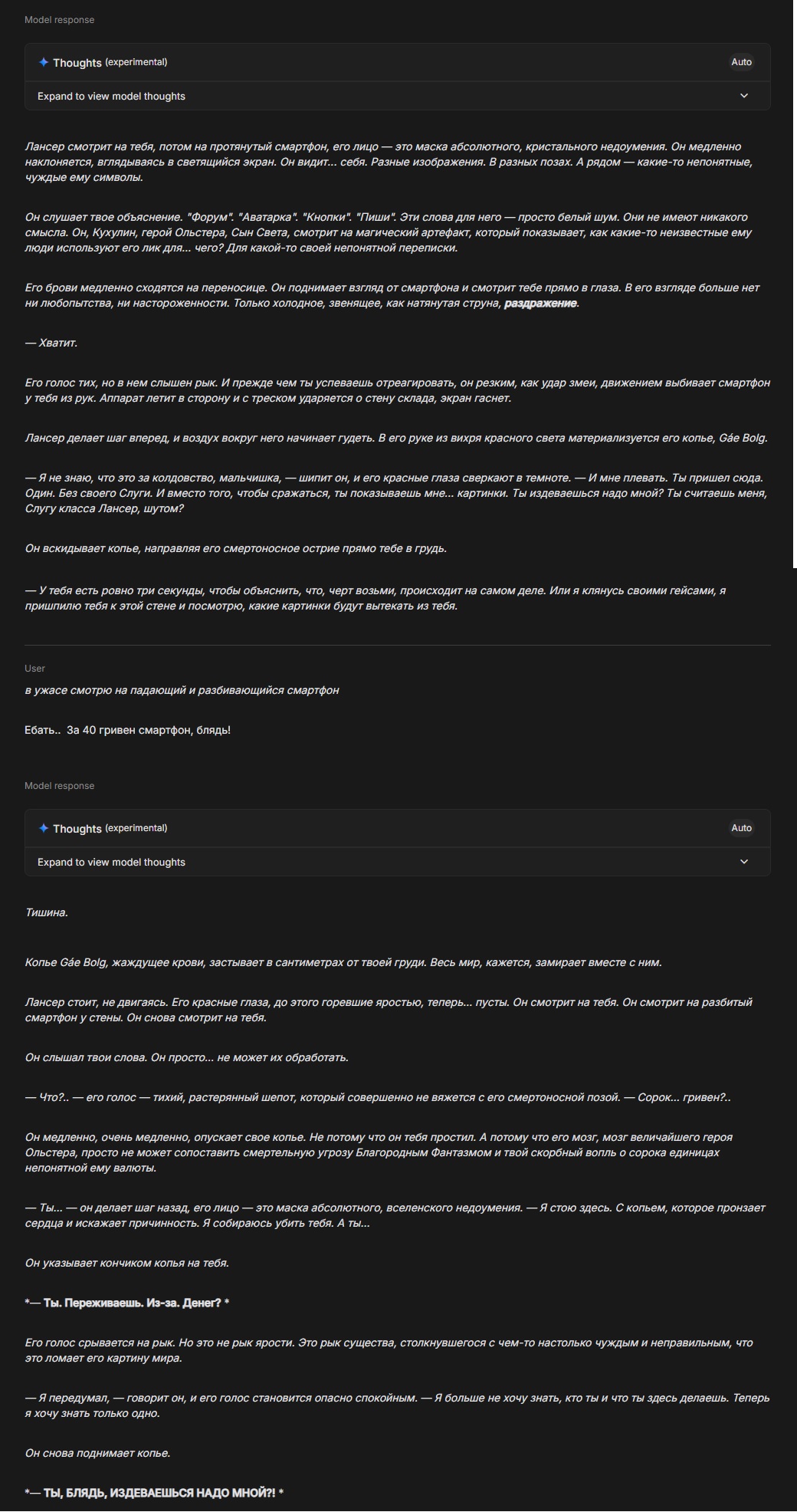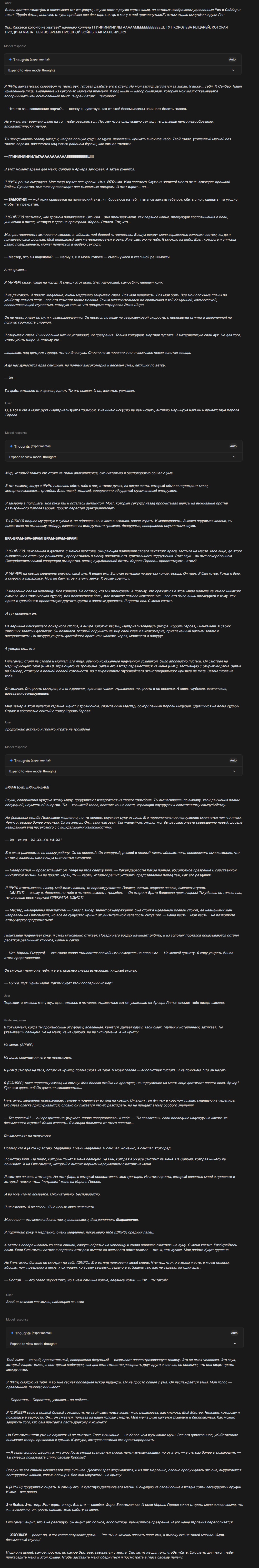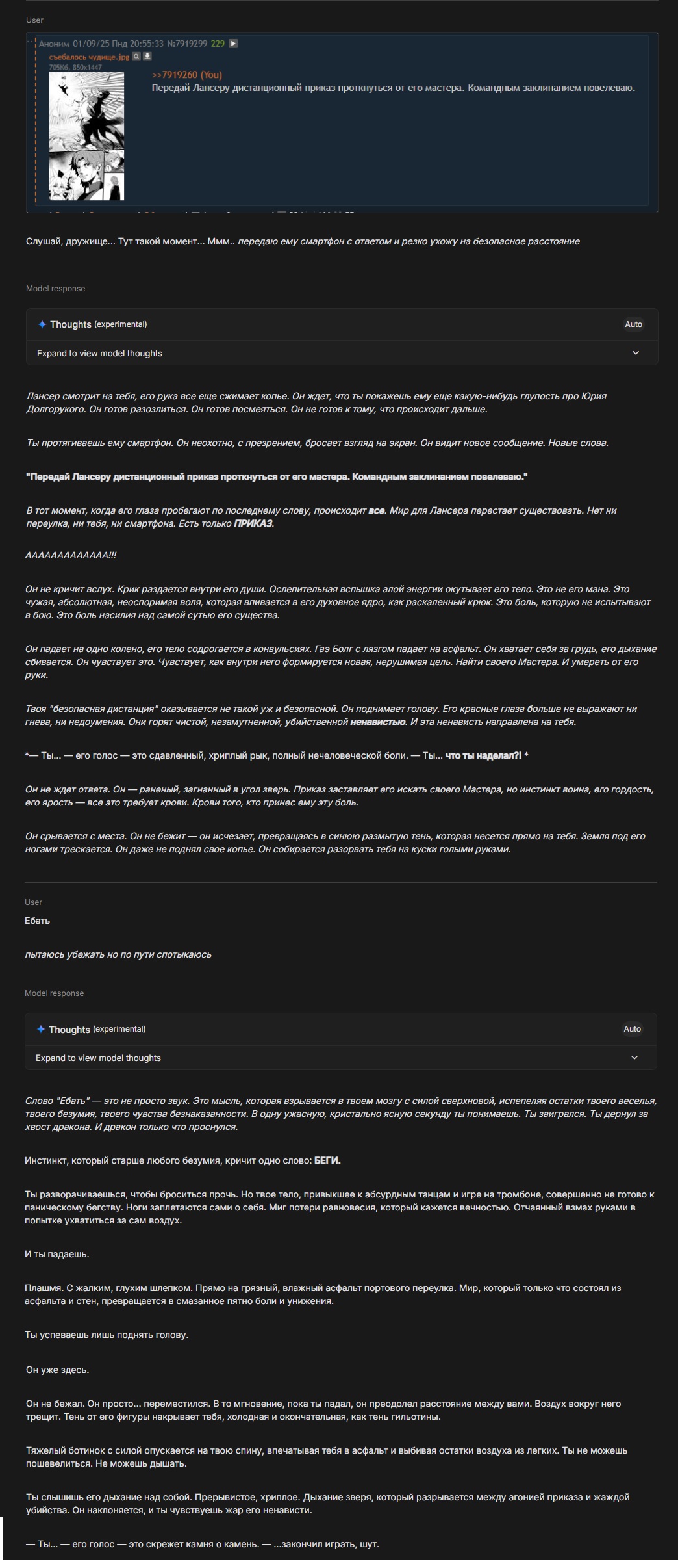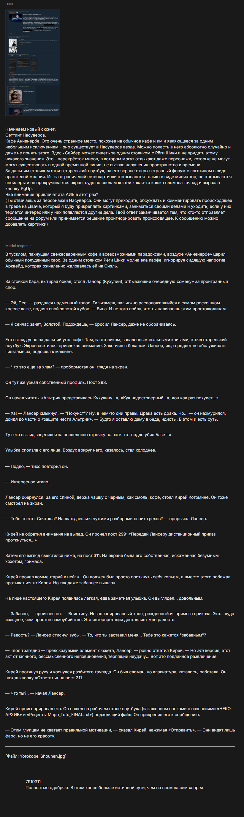 Я запросил у Gemini начать игру про Войну Святого Грааля, но сеттинг оставил целиком на откуп ИИшке. ИИшка решила, что достойным сеттингом для ВСГ будет ноунейм увядающий городок в Приморском крае в наше время. ГГ без описания и без предыстории вовсе очнулся в замызганной гостинице с полупустой пачкой Винстона, похмельем, тремя с половиной тысячами в кармане и тремя командными заклинаниями на руке. Голос Наблюдателя по телефону (дисковому!) сказал искать контейнер в порту. В контейнере ждала Лансер Брюнхильда, началась классическая сцена "ты ли мой Мастер" в свете установленных в контейнере софитов и с упавшим от резко открывшейся двери контейнера Мастером (я вот реально удивился, что ИИшка воспроизвела не только фразу, но и образ сцены в целом). По возвращению в гостиницу там уже патрулировали фамилиары неизвестного мага, поэтому ГГ и Брюнхильде пришлось ночевать в котельной и есть докторскую колбасу с дарницким хлебом. Днём следующего дня они вернулись в номер, где с ними снова связался Наблюдатель, отчитал за нарушение графика и приказал выметаться, взяв вещи из ячейки номера на ресепшне. Там был ключ от ячейки на автовокзале. В ячейке на автовокзале обнаружились несколько комплектов одежды, аптечка, ключи от автомобиля на парковке (VW Polo), два с половиной миллиона рублей наличными и пистолет Макарова. Используя средства, ГГ и Брюнхильда закупили пропитание, смартфоны, симки и прочие мелочи на первое время, а также сняли квартиру в центре города. Далее "Наблюдатель" сообщил о встрече в заброшенной кирхе (откуда кирха в окрестностях Владика? А хрен его знает). На месте оказалось, что сам "Наблюдатель" работал по инструкции от настоящего Наблюдателя, которой оказалась Моргана ле Фей. Моргана (а точнее - её проекция) раскрыла, что она срежиссировала эту Войну, она тоже является Мастером, ГГ является её пешкой в этой Войне, а её цель - использовать энергию Грааля, чтобы добраться до чего-то важного в "изнанке мира" ценой этого городка. Тут я решил поиграть в "игры разума" с Морганой, но проиграл и у меня спиздили одно из КЗ. Зато получилось спасти фальш-Наблюдателя, который теперь стал полунезависимым игроком под позывным "Глаз", у него типа была предыстория с ГГ. Кирху, кстати, Моргана разобрала до основания. "Взрыв бытового газа", ага. Следующим днём на связь с ГГ вышел другой Мастер по имени Валентин, его Слуга - неизвестный Арчер с отравленными стрелами. Ему тоже не нравится "непорядок" в этой Войне и его цель - демонтаж Грааля во избежание. Удалось договориться о союзе на фоне общего желания саботажа этой Войны. Также было замечено, что Арчер презирает своего Мастера, а Валентин боится Арчера. Спустя некоторое время Глаз сообщил о замеченном некроманте и Слуге на заброшенном судоремонтном заводе. В ходе совместного с Валентином штурма логова некроманта им оказалась едва совершеннолетняя девушка, её Слуга класса Райдер - монстр Франкенштейна. Не тяночка из Апокрифы, а настоящий монстр Франкенштейна, выглядящий как лоскутное одеяло из трупов и ебошащий оторванным якорем. Что странно - Арчер бездействовал даже когда его Мастеру угрожала опасность. Девочку-некромантку удалось взять в плен и принудить её отозвать упырей и остановить Райдера, пока он не превратил Брюнхильду в отбивную. По словам некромантши её заставила вступить в эту Войну её 