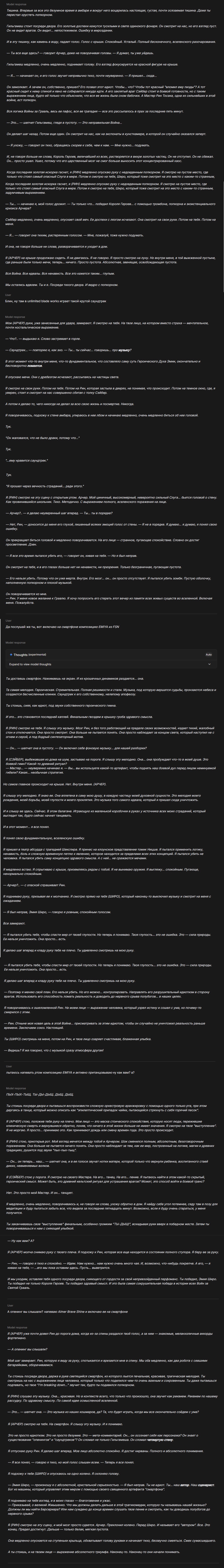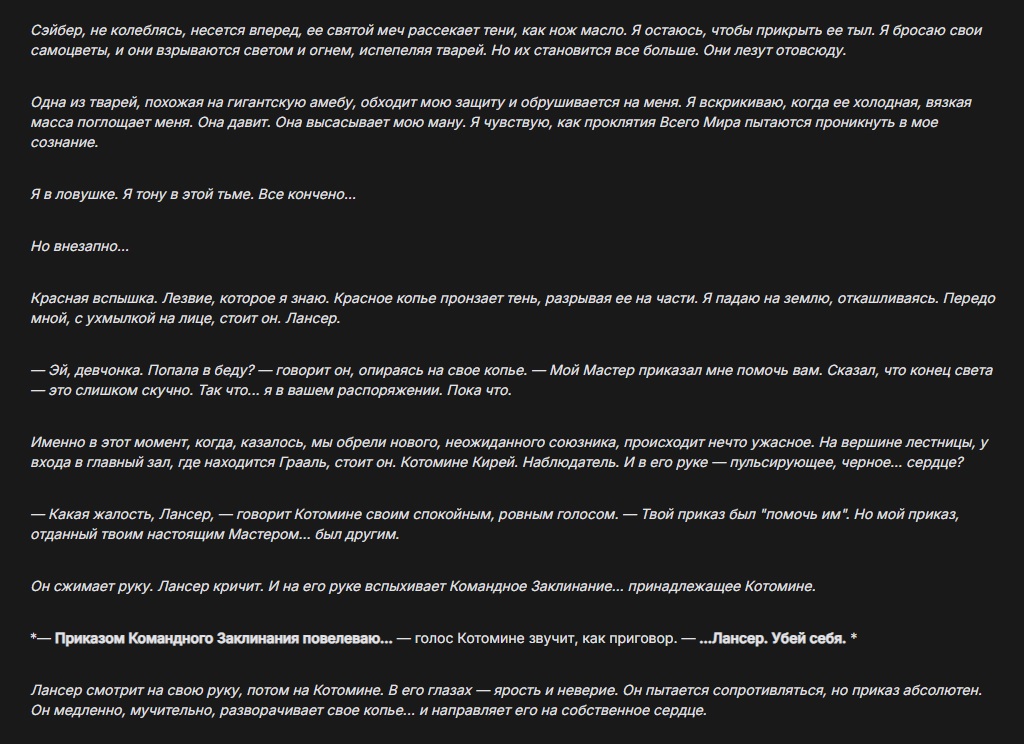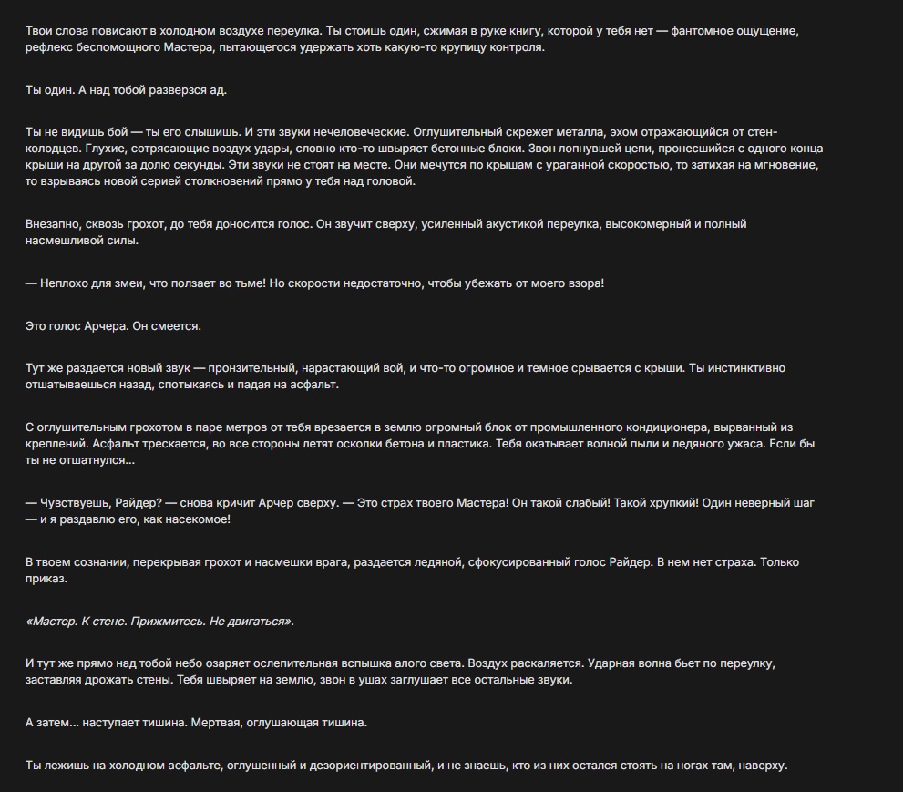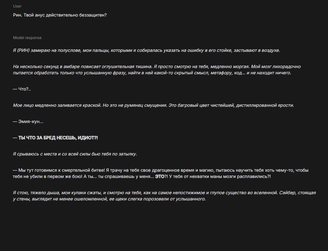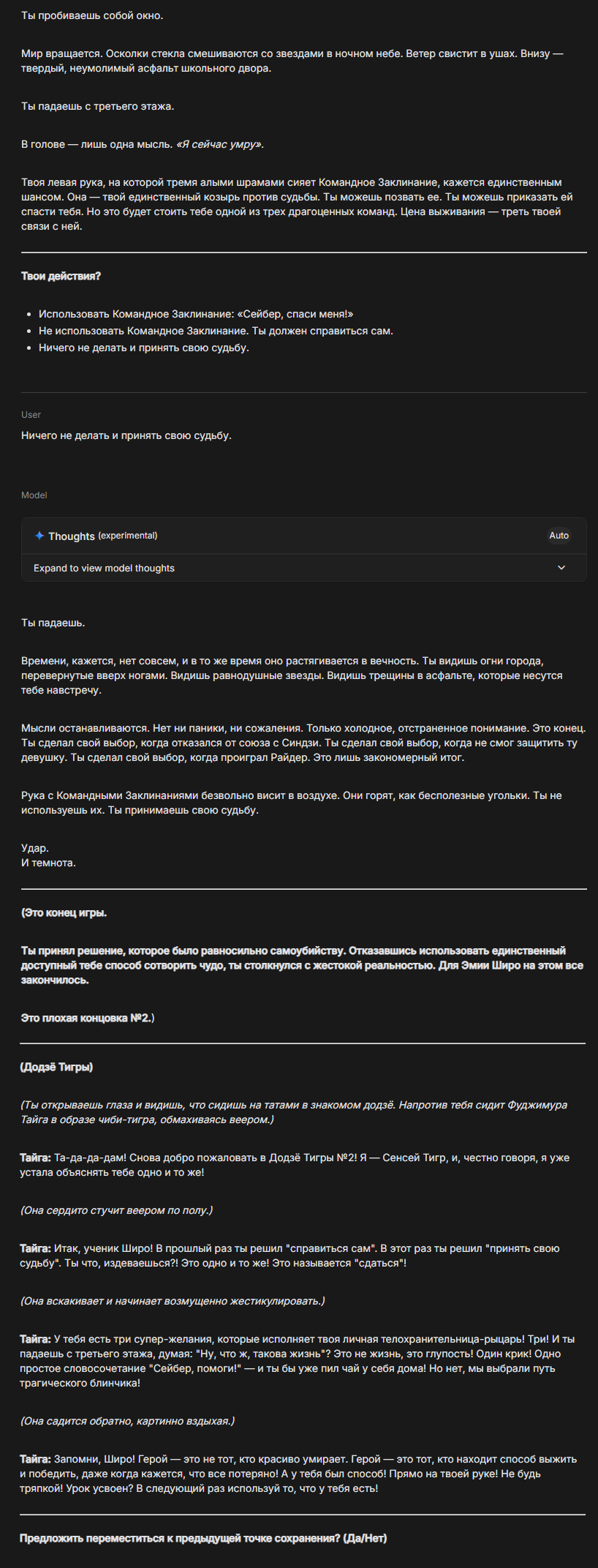 Я запросил у Gemini начать игру про Войну Святого Грааля, но сеттинг оставил целиком на откуп ИИшке. ИИшка решила, что достойным сеттингом для ВСГ будет ноунейм увядающий городок в Приморском крае в наше время. ГГ без описания и без предыстории вовсе очнулся в замызганной гостинице с полупустой пачкой Винстона, похмельем, тремя с половиной тысячами в кармане и тремя командными заклинаниями на руке. Голос Наблюдателя по телефону (дисковому!) сказал искать контейнер в порту. В контейнере ждала Лансер Брюнхильда, началась классическая сцена "ты ли мой Мастер" в свете установленных в контейнере софитов и с упавшим от резко открывшейся двери контейнера Мастером (я вот реально удивился, что ИИшка воспроизвела не только фразу, но и образ сцены в целом). По возвращению в гостиницу там уже патрулировали фамилиары неизвестного мага, поэтому ГГ и Брюнхильде пришлось ночевать в котельной и есть докторскую колбасу с дарницким хлебом. Днём следующего дня они вернулись в номер, где с ними снова связался Наблюдатель, отчитал за нарушение графика и приказал выметаться, взяв вещи из ячейки номера на ресепшне. Там был ключ от ячейки на автовокзале. В ячейке на автовокзале обнаружились несколько комплектов одежды, аптечка, ключи от автомобиля на парковке (VW Polo), два с половиной миллиона рублей наличными и пистолет Макарова. Используя средства, ГГ и Брюнхильда закупили пропитание, смартфоны, симки и прочие мелочи на первое время, а также сняли квартиру в центре города. Далее "Наблюдатель" сообщил о встрече в заброшенной кирхе (откуда кирха в окрестностях Владика? А хрен его знает). На месте оказалось, что сам "Наблюдатель" работал по инструкции от настоящего Наблюдателя, которой оказалась Моргана ле Фей. Моргана (а точнее - её проекция) раскрыла, что она срежиссировала эту Войну, она тоже является Мастером, ГГ является её пешкой в этой Войне, а её цель - использовать энергию Грааля, чтобы добраться до чего-то важного в "изнанке мира" ценой этого городка. Тут я решил поиграть в "игры разума" с Морганой, но проиграл и у меня спиздили одно из КЗ. Зато получилось спасти фальш-Наблюдателя, который теперь стал полунезависимым игроком под позывным "Глаз", у него типа была предыстория с ГГ. Кирху, кстати, Моргана разобрала до основания. "Взрыв бытового газа", ага. Следующим днём на связь с ГГ вышел другой Мастер по имени Валентин, его Слуга - неизвестный Арчер с отравленными стрелами. Ему тоже не нравится "непорядок" в этой Войне и его цель - демонтаж Грааля во избежание. Удалось договориться о союзе на фоне общего желания саботажа этой Войны. Также было замечено, что Арчер презирает своего Мастера, а Валентин боится Арчера. Спустя некоторое время Глаз сообщил о замеченном некроманте и Слуге на заброшенном судоремонтном заводе. В ходе совместного с Валентином штурма логова некроманта им оказалась едва совершеннолетняя девушка, её Слуга класса Райдер - монстр Франкенштейна. Не тяночка из Апокрифы, а настоящий монстр Франкенштейна, выглядящий как лоскутное одеяло из трупов и ебошащий оторванным якорем. Что странно - Арчер бездействовал даже когда его Мастеру угрожала опасность. Девочку-некромантку удалось взять в плен и принудить её отозвать упырей и остановить Райдера, пока он не превратил Брюнхильду в отбивную. По словам некромантши её заставила вступить в эту Войну её 
