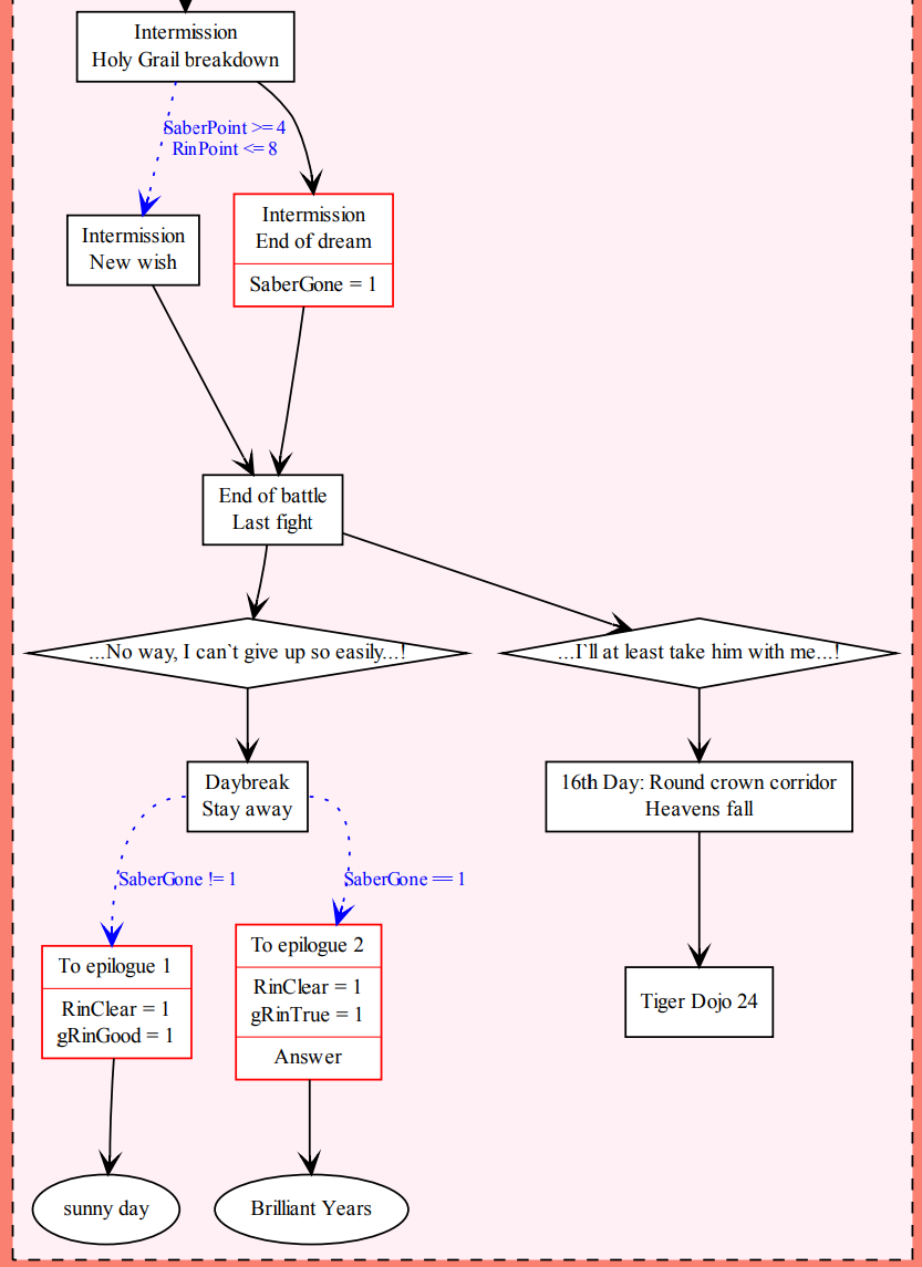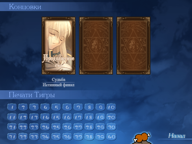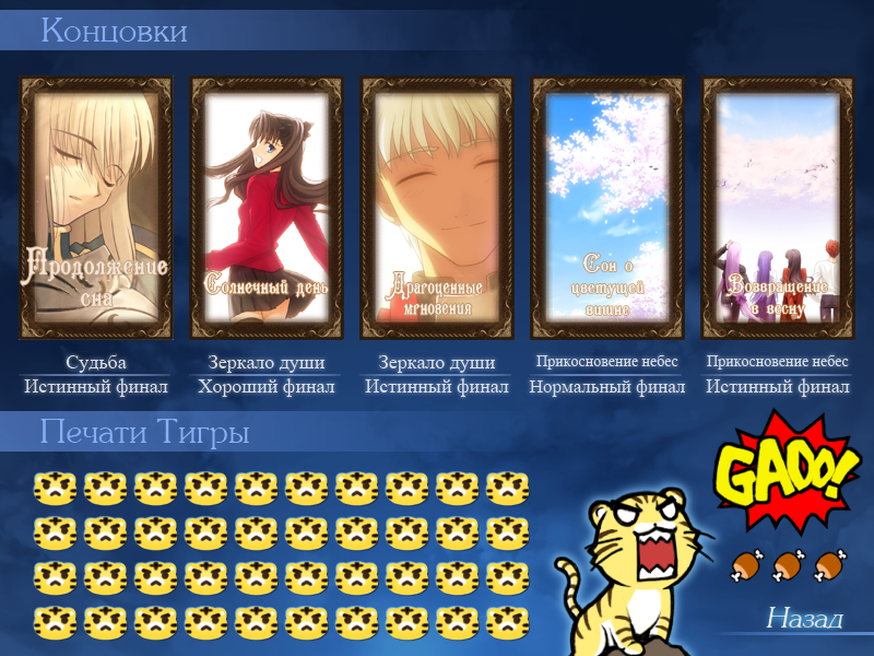 Сейчас начал пролетать плохие варианты чтобы собрать все печати Тигры, как минимум те кто отвечали мне в треде правы, это реально ржакич который стоит своего просмотра. Плохие концовки И Сдох даже раскрывают некоторые детали что не были показаны при основном пути, а это ещё лучше дополняет картину происходящего. А так же альтернативные варианты не дающие баллы в копилку отношений, самое примечательное это смерть Синдзи от рук Илии, что можно увидеть лишь выбрав вариант не поднимающий отношения с Сейбер.