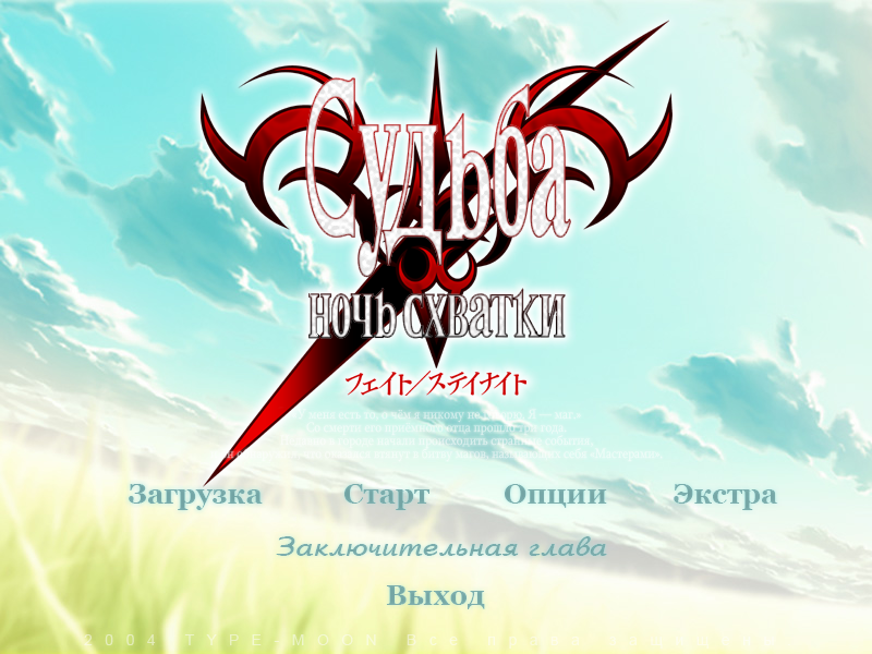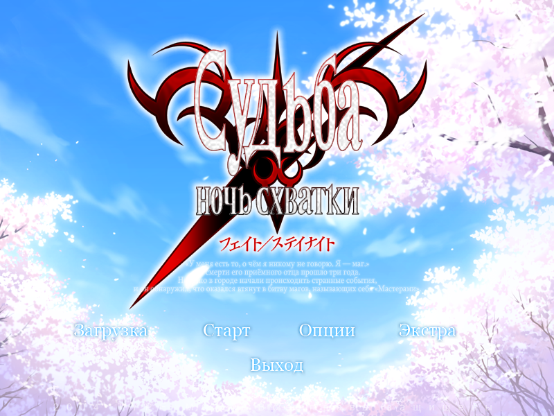 Что входит во франшизу Fate? Визуальная новелла Fate/stay night - https://vndb.org/v11 Содержит в себе три рута (Fate; Unlimited Blade Works; Heaven's Feel. Полностью экранизированы.) Fate/stay night (2006) (смотреть на свой страх и риск) Fate/stay night: Unlimited Blade Works (2010) - полнометражный фильм. Fate/stay night: Unlimited Blade Works (2014 -2015) - 25 эпизодов. Fate/stay night Movie: Heaven's Feel (2017 - 2020) - 3 полнометражных фильма. Fate/Zero (2011-2012) - 25 эпизодов. Основой является лайт-новелла Гена Уробучи. Из-за того, что она целиком спойлерит оригинал, начинать с неё крайне не рекомендуется. Ссылка на оригинальную новеллу Fate/Zero: https://www.baka-tsuki.org/project/index.php?title=Fate/Zero Ещё настоятельно рекомендуется прочитать Fate/hollow ataraxia. Является единственным каноничным продолжением Fate/stay night - https://vndb.org/v50 По просьбе инвалида закрепляем русификатор https://drive.google.com/drive/folders/1imzsMz9YKJeeaFDbcGCG7GzgkveA0b-j