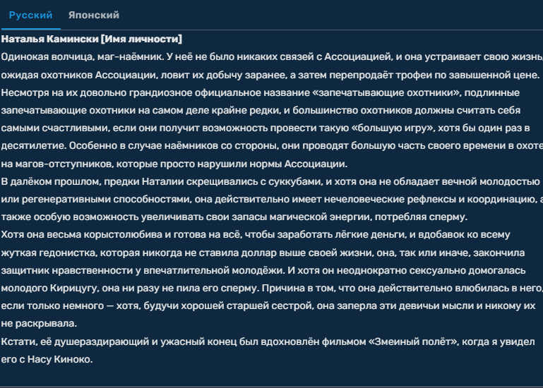 На данный момент пока что это весь прогресс. Общая сумма повествования - 184.5 тысяч тикетов. По ощущениям похоже на первую половину Fate/Zero, где каждый союз - это направленные друг другу в спину ножи. Двойные игры, подготавливаемые предательства, хрупкие альянсы, и это пока неизвестны ещё два Мастера. Что интересно - пока что Грааль по сути никому не всрался, но понятие о "порядке" у всех разное. За кадром повествования остались: прослушивание на автомагнитоле Цоя, приготовление оливье и селёдки под шубой, просмотр советской классики кинокомедий, совместное распитие водки на кухне хрущевки под Розенбаума и всё такое.