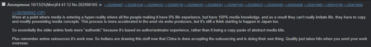 >>7934798 >Тема переездов даже в маняме не всплывает. Сразу видно трёхтайтлового, лол. Там нередко всплывает тема того, что если персонаж хочет расти в сферах искусства или науки, то ему надо на Запад переезжать, родители нередко на Западе работают чтобы бабок налутать ну и даже целый тайтл есть про приключения врача японской национальности в Гермашке, куда он переехал, чтобы там учиться т.к. там вся наука. Так что да, прямо в лоб эмиграцию никогда не пропагандируют (и странно бы если так делали), но у кого глаза и уши не на жопе да увидит, что если хочешь реальную движуху наводить в своей области, то надо на Запад переезжать.