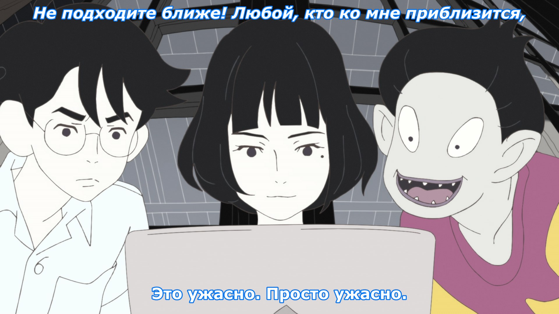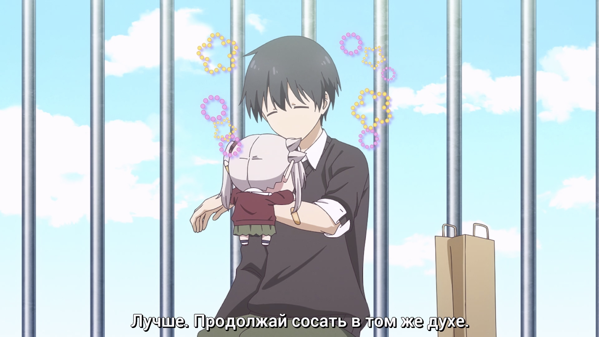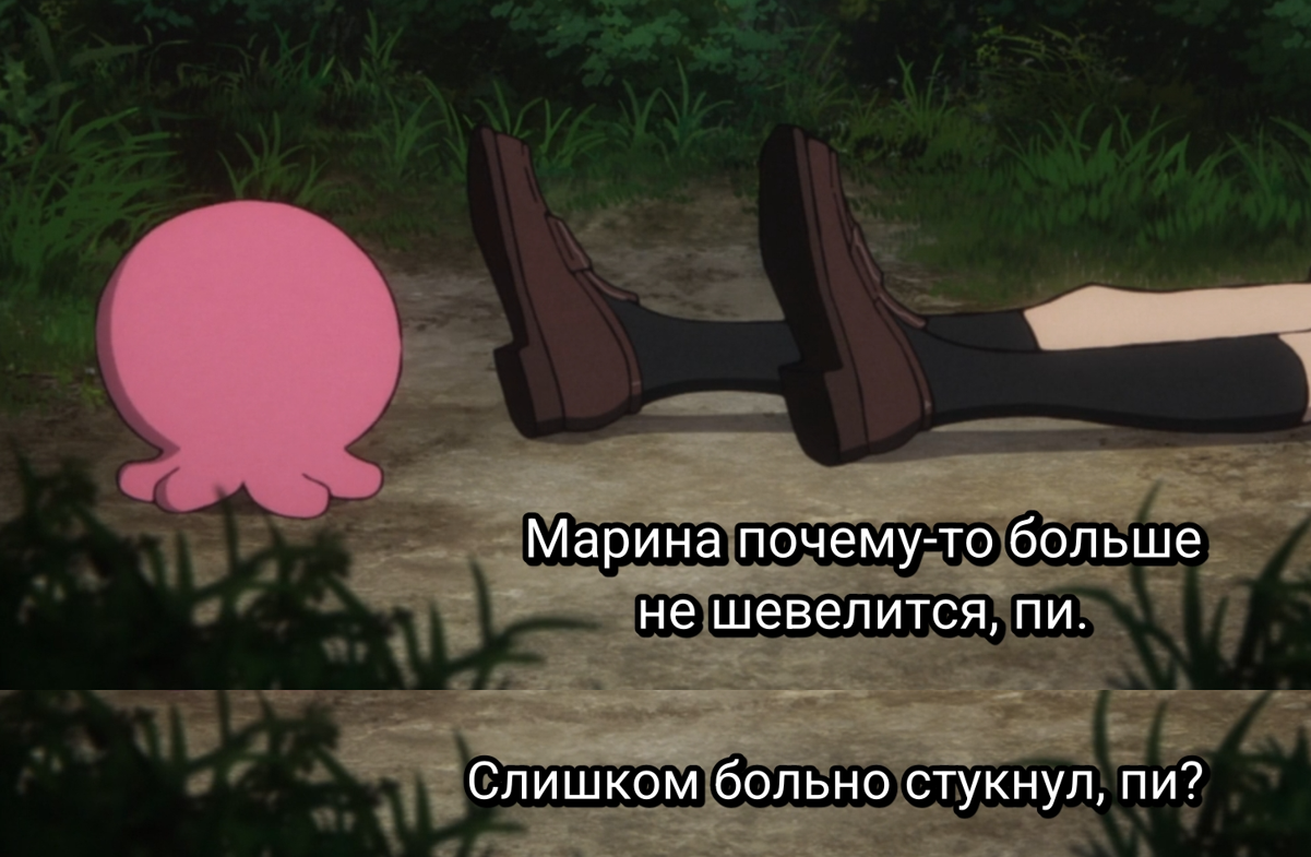 Концовку слили. Тентакль каким-то хуем достал ебанашкам память из будущего альтернативных таймлайнов и мог влиять на события уже не существуя. Но даже при этом, описываемый сюжет не работает, потому что с кинпацу он особо близок не стал. Всё что он для неё сделал, пообещал убить одноклассницу в прошлом, но вместо этого убил её саму. У неё просто нет причин внезапно расчувствоваться и передумать убивать шкуру которую винит во всех своих проблемах. Она уже её с удовольствием отпиздила, имея всю эту память и собиралась как джокер показывать ей фокус с карандашом, так что внезапный разворот к дружбомагии смотрится нелепо. Лучше бы мамка осьминога с санитарами прилетела и разрулила бардак. А так получается что сюжет был, что его не было - ничего вообще не изменилось. Две ебанутые повторяли судьбу мамок и без осьминога. То что они теперь вроде как дружат, не меняет буквально ничего. Хуйня короче. Но забавные моменты и о чём подумать есть, так что 7 заслуживает.