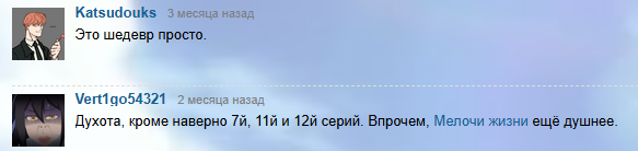В анимках часто говорят, что вы не смотрите на то как излишними и крайними кажутся эмоции в аниме - это просто так принято, мультик все дела. И последний пример такого аргумента/дефа линии слышал в Ван Писе где внезапно оказалось что старая гвардия серьезных топов в последней арке себя ведет то как шуты, то как ебаные спермотоксикозники, гоняющиеся за юбкой Шаки. И типа такое поведение нарочито возведено в абсолют для мультяшности, анимешности. Что аниме свойственны эмоции возведенные в абсолют.