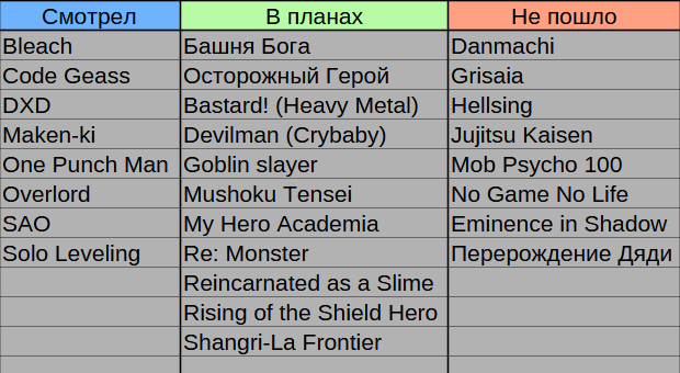 Самостоятельно начал наворачивать всякие исекаи и фэнтази со скиллами. На какое-то время займёт, но чётких попаданий пока не нашёл. Что касается манги/манхвы, то да, там намного больше кандидатов, уже кинул несколько тайтлов в планы. Знаю, в ранобе и веб-новелках такого довбра ещё больше, но в данный момент хочу подобрать именно анимацию. Посмотрю тайтлы из ответов на >>7944438. Собственно, вдогонку и решил написать. Также начал импровизированный список того, что собрал на данный момент, чтобы не плодить посты с просмотренным тайтлами и ответами "смотрел, не то". Вернусь через пару месяцев с таким же реквестом и наполненной таблицей.