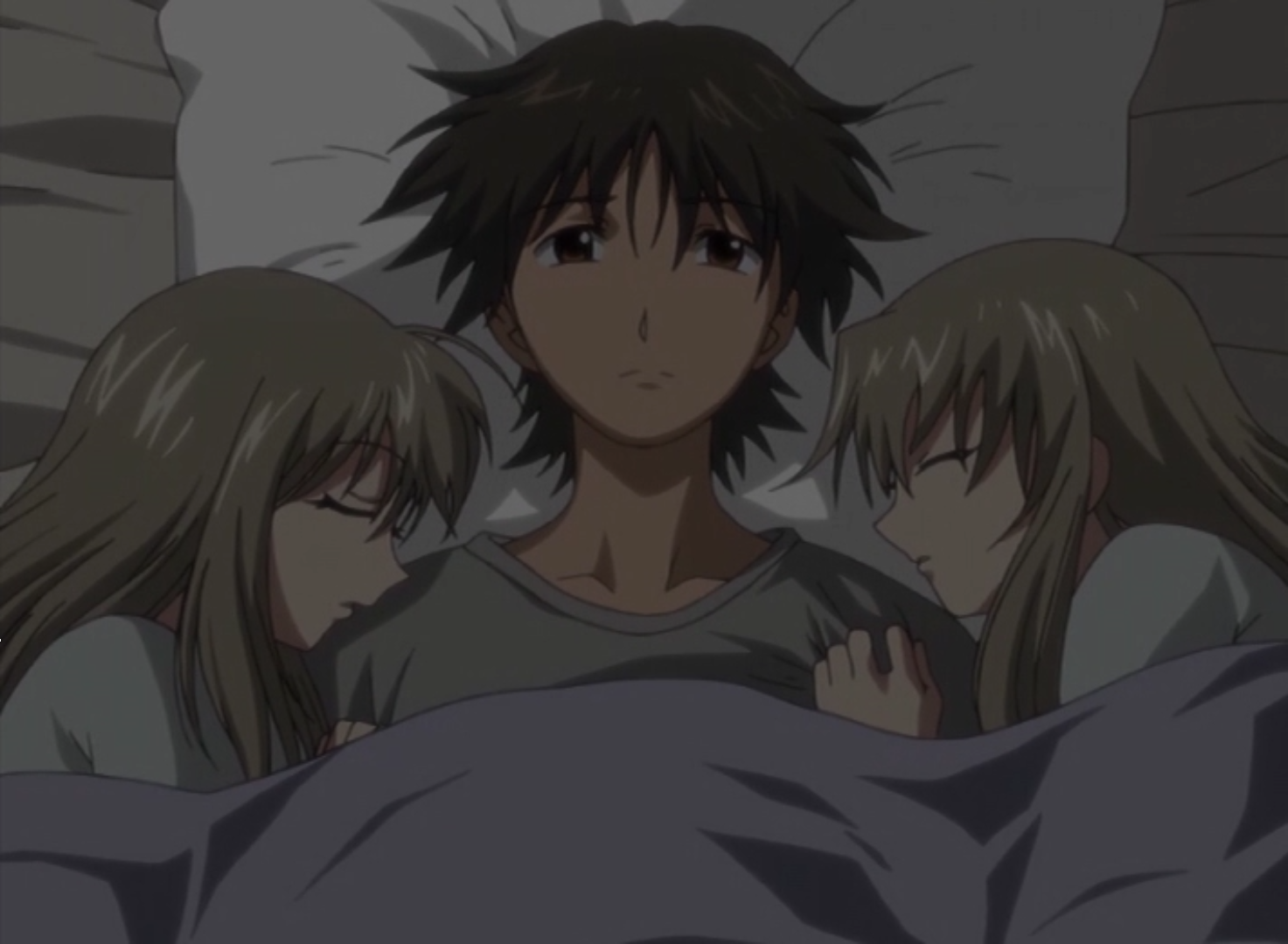 В аниме частая тема что сестрёнка или мама без ума от братика/сыночка. Напомните название маниме где этот момент максимально не считая хентая гипертрофирован: имота с мамой на пару конкретно текут по ояшу. Помню они там слетали по лестнице со второго этажа когда он домой приходил, а он особо внимание на это не обращал. Они именно вместе по нему сохли и там был конкретный подтекст на инцест, а не просто "братик такой каваиии". Жанр комедия, возможно гаремник, но это не точно.