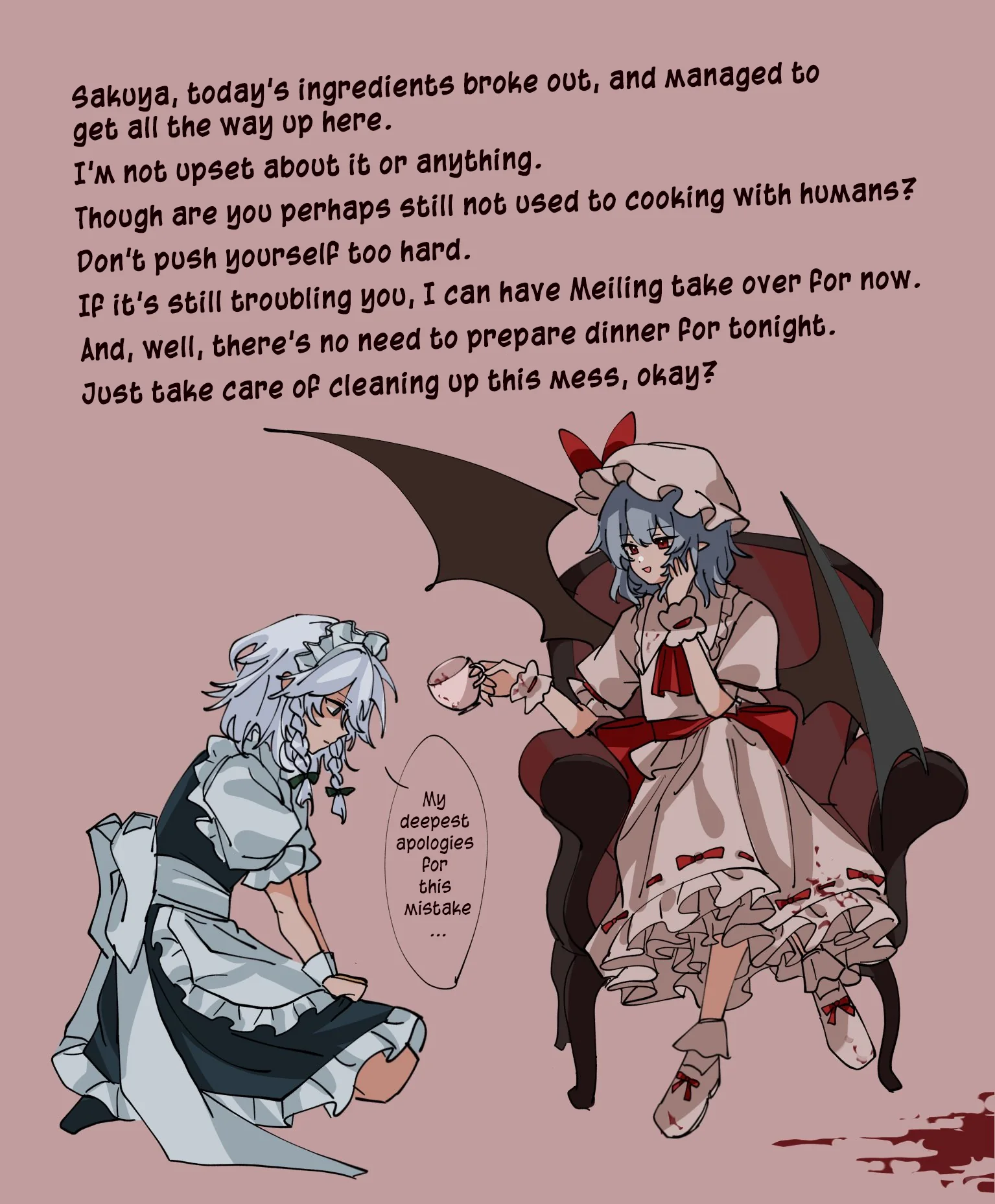 Взять ту же Сакую - она не презирает и не избегает людей как это в фантазме показано. В той же игре, в концовке за марису сакуя её наоборот покрывает от хозяйки (то что та в крысу посещает особняк с целью почитать) и даже приносит ей чаёк. А в какой то манге пожаловалась что ремилия ей все нервы вымотала.