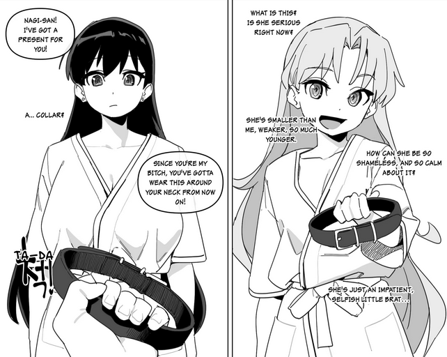 >>7959154 Юриатины навалили в псевдодарке. Автор на нипонце про рабство ничего не знает, видимо, раз гэгэшка с клеймом преспокойно по городу гуляет, а мимокроки лишь пальцем тыкают и гыгыкают - "ля, пали, рабыня пошла". Странно и неестественно выглядит, хоть бы лицо под капюшоном спрятала или маску надела, ей-богу.