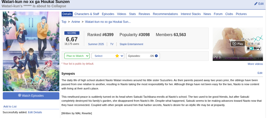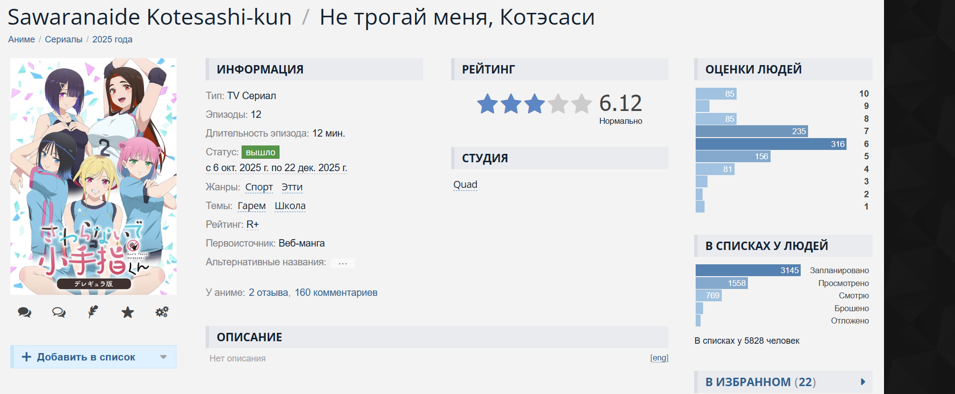 Неожиданная годнота, среди тайтлов с оценкой 6.* Стиль повествования напоминает анимахи 10х годов. Чиловая романтота с минимум драмы. Было конечно пару настолько унылых эпизодов что хотелось дропнуть, но обычно сразу за ним шла годнота. Правда, немного поздаебали байты на еблю к концу. А завершённый сюжет не может не радовать. Хотя в конце так и не объяснили нахуя она ему грядки сломала.