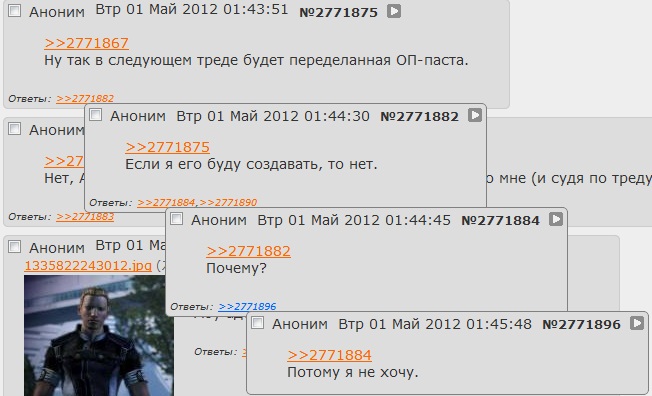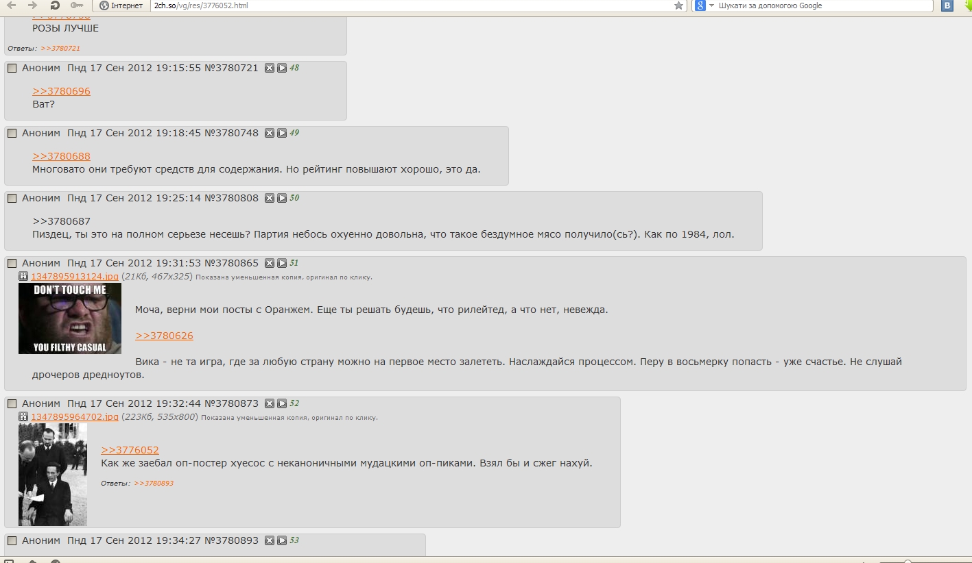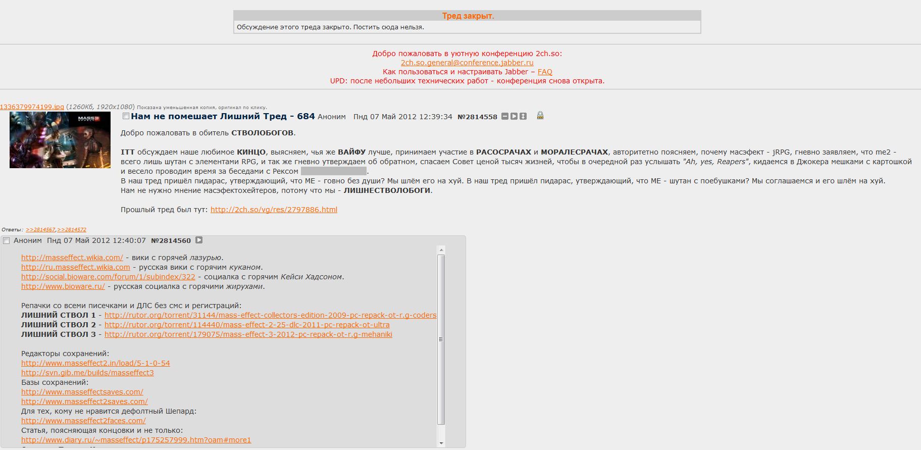 Еще пару лет назад, /vg/ был в два раза менее населен, и такого явления как "официальные треды" не существовало и в помине, они не были долгоиграющие и время от времени интерес к ним падал, обсуждали новые игры и т.д. Теперь же, один /vg/, может сравниться по скорости постинга и посещаемости с другими бордами. Это не плюс, это не минус, это наша реальность.