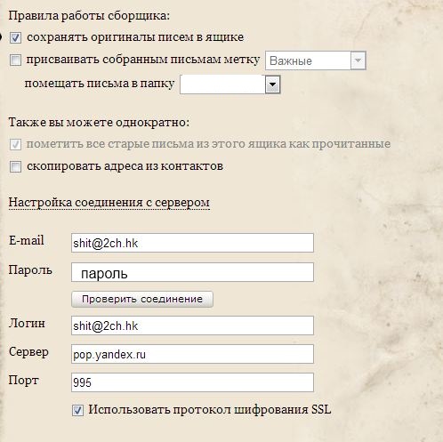 Вот я, например хочу сделать так, чтобы гуглопочта собирала почту с моего ящика на харкаче. Но гугл говорит что такого домена вроде нет - почта же распологается на яндексе. Пишет, что гмаил не может найти РОР-сервер. Так вот, какие настройки надо использовать?