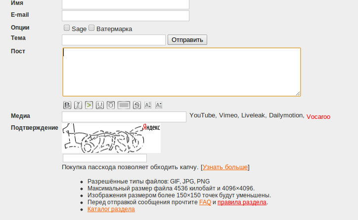 Ваш этот говнач совершенно не приспособлен для людей с медленным интернетом. Отключать капчу нельзя, капчу вводить надо. Отключать джаваскрипт нельзя, форма постинга не откроется. Большие треды открывать нельзя, слишком дохуя превьюшек, тяжёлые, каким-то хуем в гиф все, размер в хтмл не указан, страница дёргается пока подгружаются изображения. Быстрый ответ делать нельзя, потому что это говно будет ждать пока загрузится весь тред и все превьюшки из него. Говно. инбифо нищеброд не человек