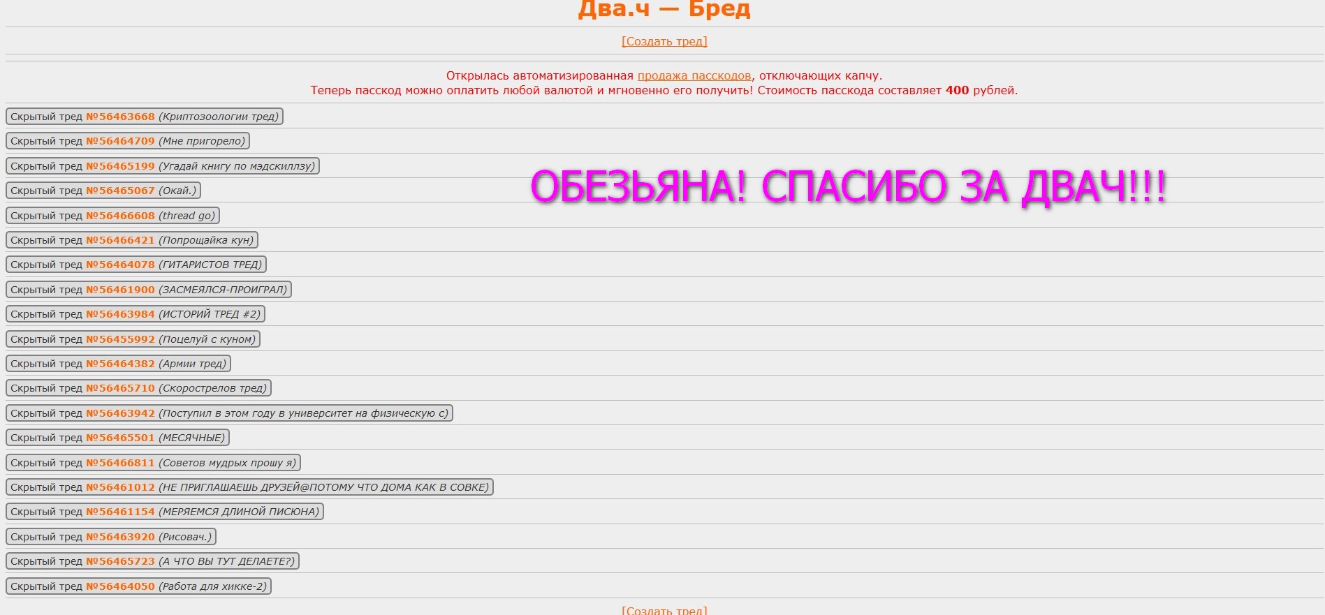 Двач находится под массивным ДДоСом, поэтому могут быть трудности с доступом или постингом. Не знаю, кто там тратит всю зарплату, или продал почку/взял кредит на это дело, учитывая, что в некоторые моменты суточная атака на нас примерно обходилась в 500-1000$ с SYNфлудом, UDPфлудом, обычными массовыми хттп-запросами, теперь еще и вайпы недобордами, но что есть, то есть.