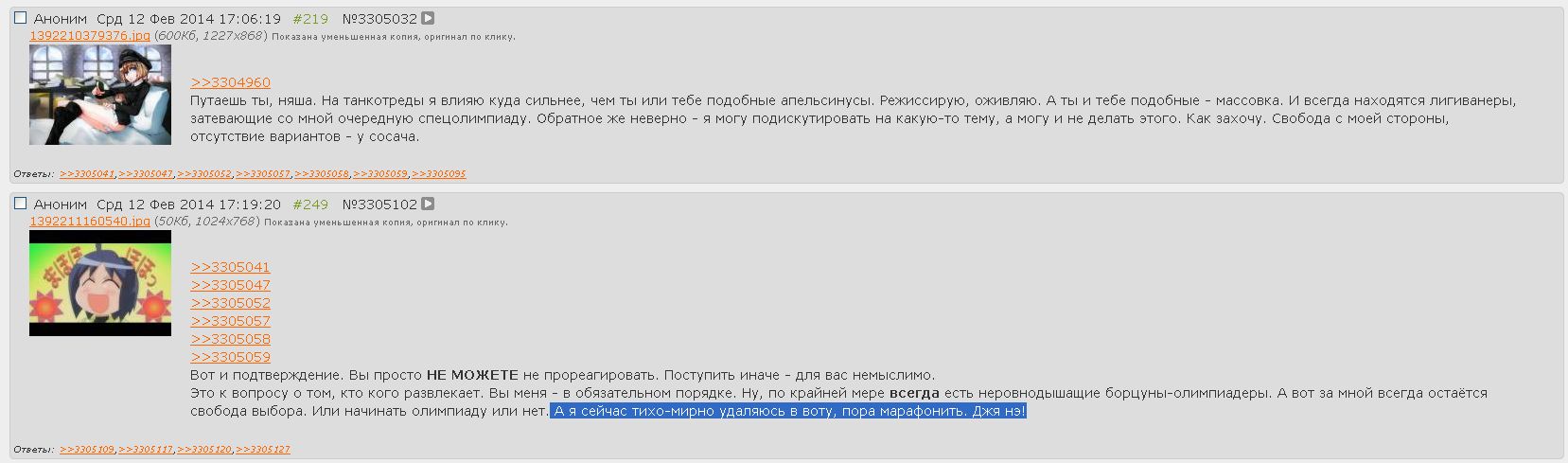 Хуй знает куда писать, напишу тут.Блядь, Абу, сделай что-нибудь с вниманиеблядками в танкотреде, это же лютый пиздец, ну ладно 1-2 пика, ну хуй с ним, 10, 20 постов за тред, но это, ебаные пиздоглазые пики, пиздоглазые пики эвривере. А теперь еще и пикрелейтед, совсем он уже охуел, у сосача вариантов нет, битард унижает сосач на его собственной борде, блядь. Дай нам нормального модера, ну пусть хоть недельку его гнобит банхаммером, может поутихнет, сил нет сидеть.