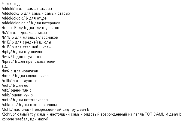 И наконец, /old/ - пристанище для тех, кто чувствует себя старым %%и не нужным%%, здесь нет ограничения по тематике, кроме как обсуждения тем, которые могут заинтересовать, в основном, только людей в возрасте. Семейные проблемы, олдфажные игры-кино-музыка, пожаловаться на то, что раньше трава была зеленее и на отсутствие мозгов у поколения нынешнего. Особо жирные школьники-тралли будут рандомно опиздюлены банами.