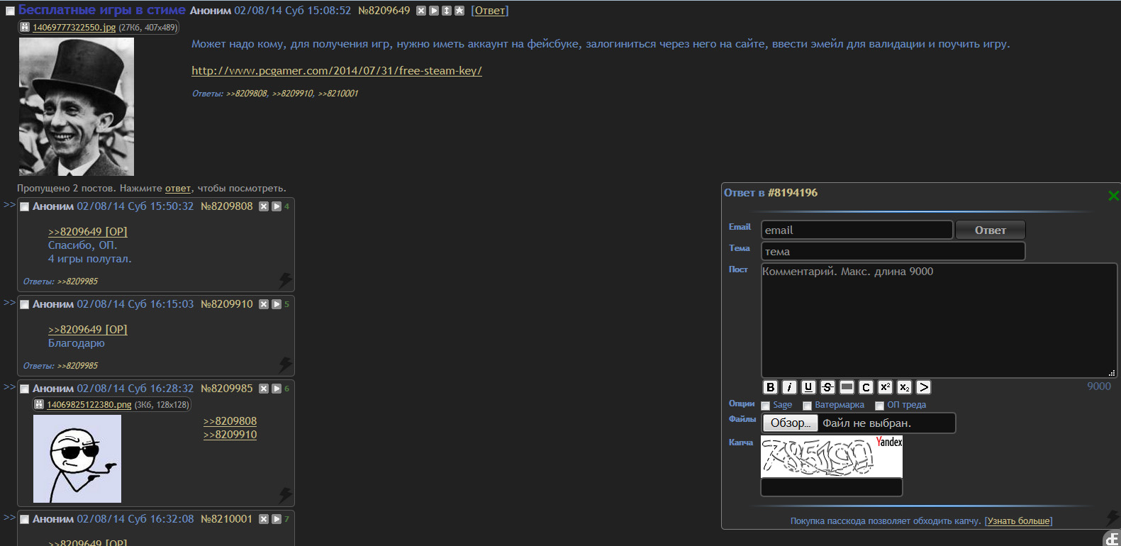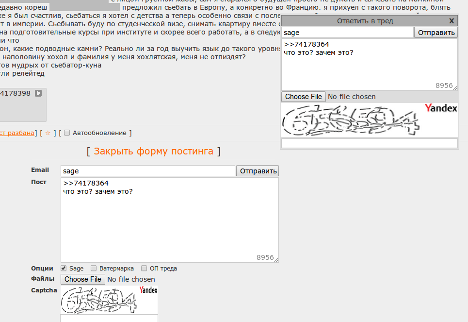 1) Неебически бесит выскакивающий ответ в веге и политаче. Ты хочешь поссать в тред и дальше мимо пройти, а тебе нахуй после отправки тред открывает. Ну и вообще какая-то ебаная два-нольность, как будто на баннер щелкаешь. 2) Почему ссылки на ответы на пост в посте не показываются в половине случаев?