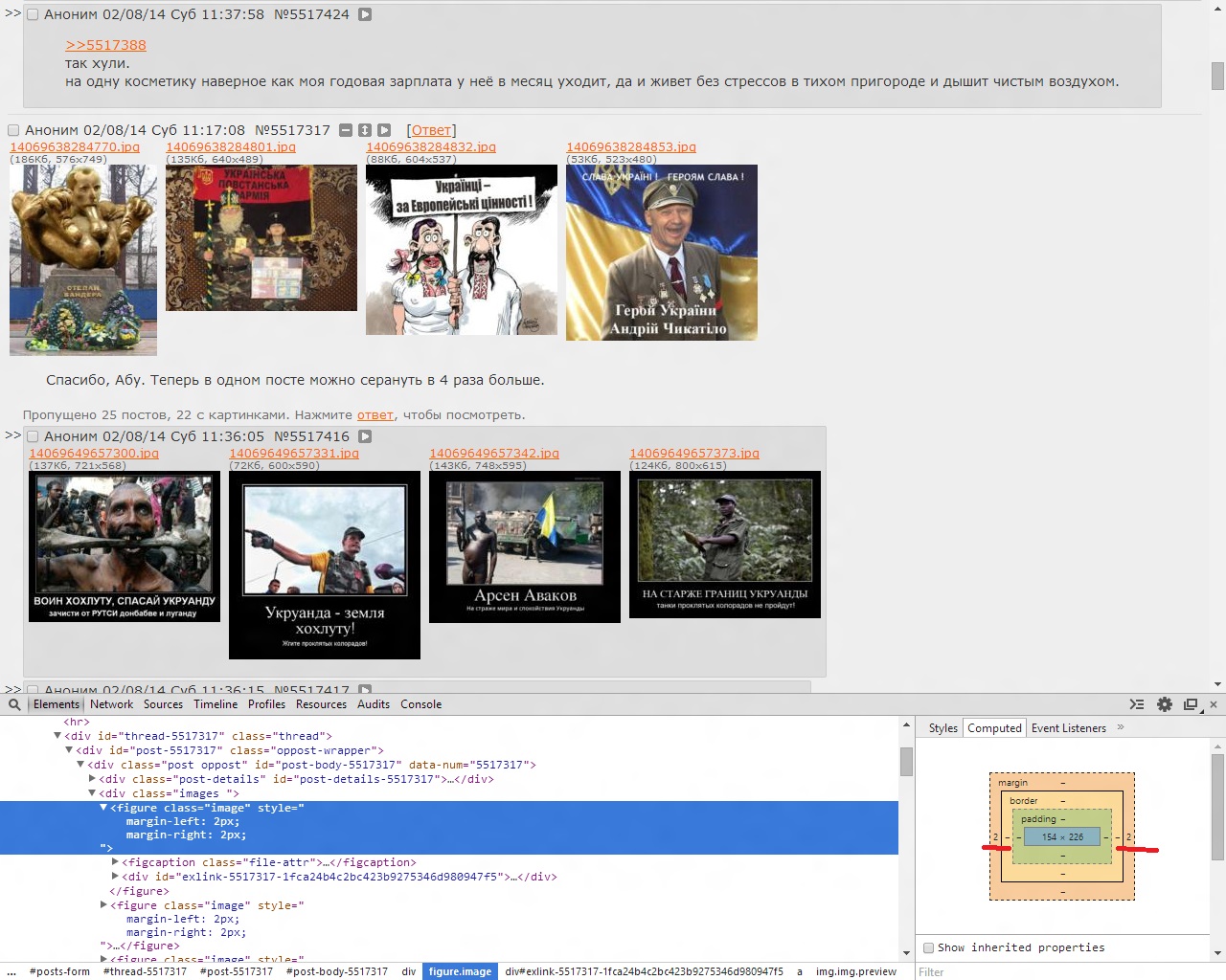 Абу, если ты прислушиваешься к мнению посетителей захваченной тобой ракоборды, то вот мои предложения по мере их важности на мой взгляд. 1) Сделай нормальные (т.е. привычные, как было) отступы между контентом поста и его границей. 2) Верни старые междустрочные интервалы. 3) Верни старое обтекание изображения текстом: изображение справа - текст слева, т.е. убери это новое обтекание вообще. 4) Сделай название прикрепленного изображения и его размера на одной строке. 5) Уменьши шрифт ссылки на ответ поста, которая >>post_num
