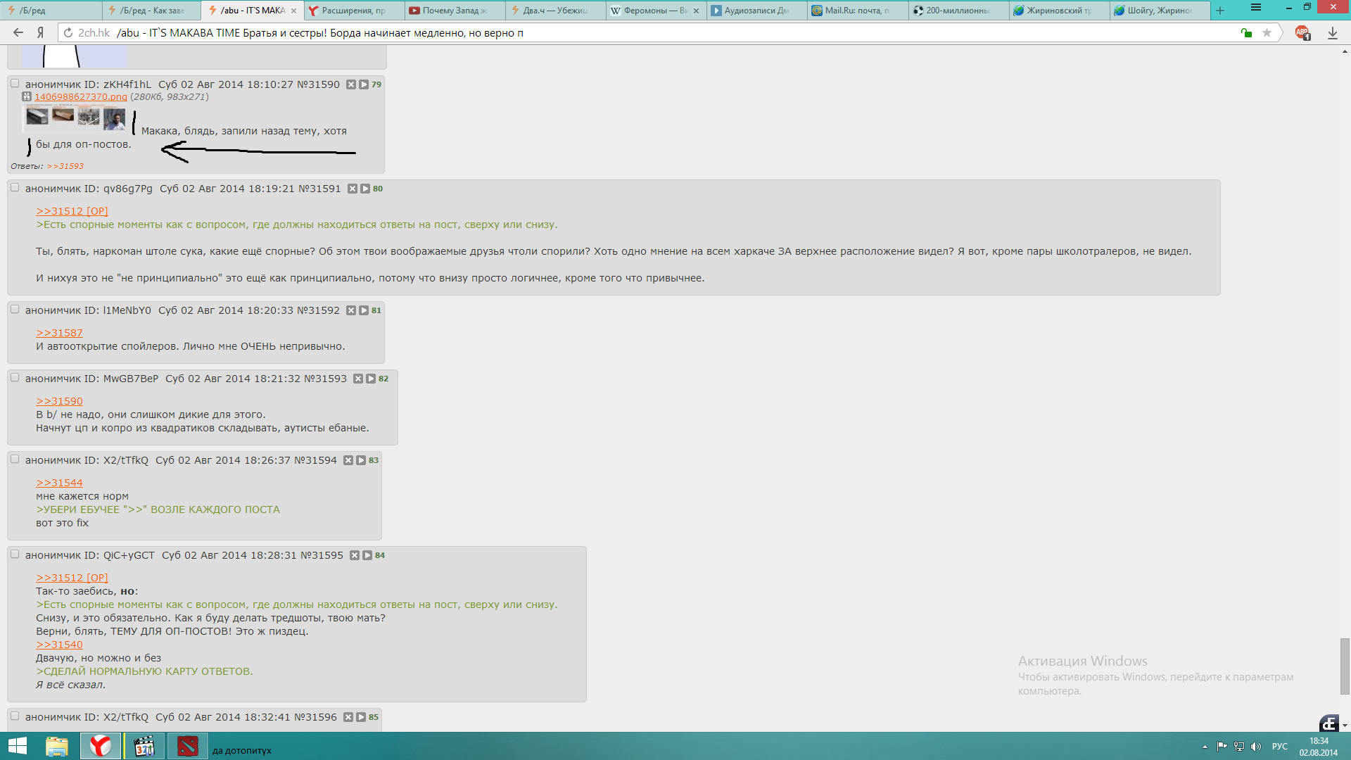 >>31512 Абу, напряги пердоликов, чтобы сделали совместимость старых тредов с макабой, а то все треды созданные до 02.08 стали пикрелейтед ответов нет, ссылки на посты не работают - отследить нить практически невозможно. По этой причине, пожалуйста, попридержи ввод макабы для медленных тематик - второй раз слушать охуительную историю про АРХИВЫ ВСЕХ ДОСОК не хочется.