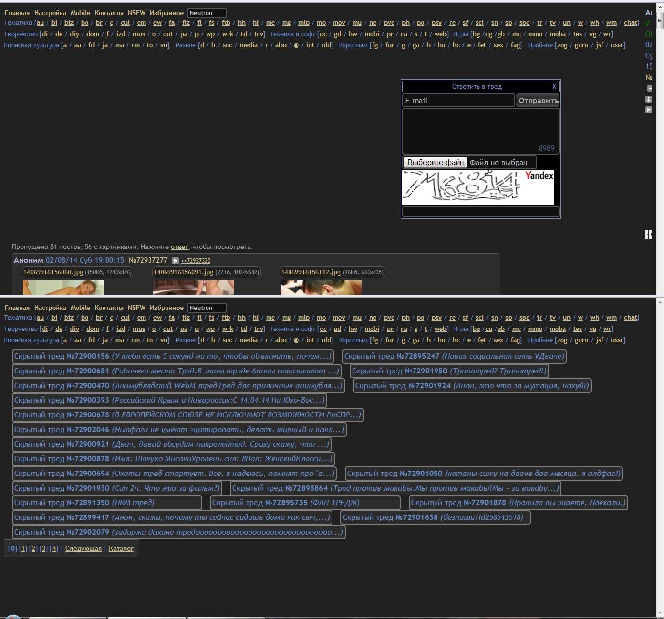 1. Сделай чтобы нить ответов не обрывалась, когда просматривается более двух постов. 2. Добавь кнопки разметки. 3. Почему форму ответа расширять надо после пердолинга с попаданием в нужную область, которая пиздец какая маленькая? 4. Немного не по интерфейсу. Не возвращай свои "пост раз в минуту". Совсем ебанулся уже.