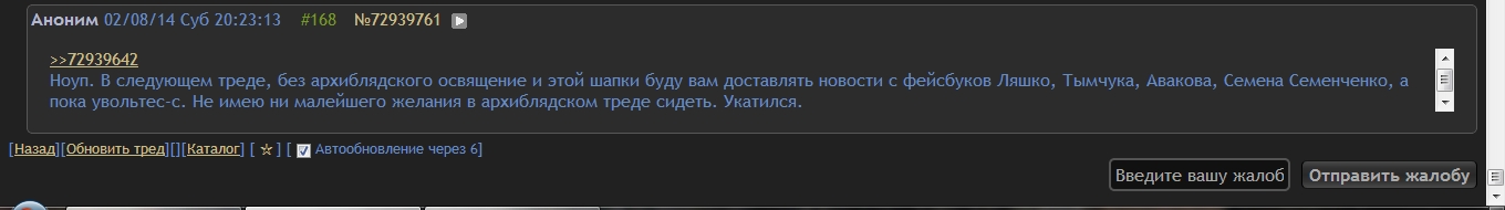 Открываем нулевую /po: -Valio в ответ на контрсанкции закрывает производство в России (бугурт хипсетров) -АТО НА ДОНБАССЕ ТРЕД №380 (хохлы на самоподдуве) -Майдан 3.0 -Телефон штаба доверия АТО -КАК ПО НОТАМ -Обезумевшего рубля тред №97(именной тред атеншон-вхоры с анархозначком и её гарема) -Теперь это будет тред манямирка россиян. -Всем Санкции -цензор.нет -Медведь мог спасти Россию, распустить парламент там -лидер сепаратистов ДНР Бородай подал в отставку -ЧТОБЫ НАТО РАЗБОМБИЛО КРАСНОДАР -Европа ВСЁ -Война началась. Нам пиздец. Владивосток-кун -пидорашек загоняют под шконку -Вопрос залупкам на засыпку