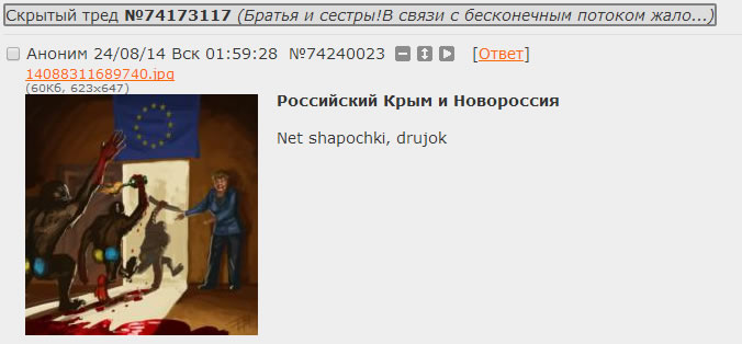 То есть,пропаганды станет в два раза больше. Крымотред продолжает круглые сутки висеть на нулевой, рядом ещё несколько тредов о текущем, только теперь это всё будет дублироваться на отдельную доску. Зато вайпать крымотредами теперь нельзя, как и создавать ложные.