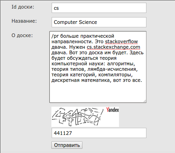 Предлагаю необычную борду: /schl/ - школа. Суть токова: ученики разных классов школы (а давайте признаем, это основной контенгент борды) запиливают себе по треду на предмет и там выпрашивают советы в помощи по решению задач, по созданию шпоргалок, и тем для удобоваримого освоения материала по конкретному предмету. Что ни тред, то отдельный предмет. Заодно можно будет бсудить такие насущие вещи как технику дёргания за косички ЕОТ, свежие новости несвежих блюд из школьной столовой, где прятать сигареты в школе и дома, что не получить пиздюлей от учителей или папани, какие развлечения типа подушки-пердушки, кнопок и хлопушек можно устроить в классе, как правильно подставить одноклассника Ерохина, запихнув в портфель Сычёва компрометирующий Ерохина предмет, а так же почему Двач уже не тот и какие сейчас выходят новые игры. inb4: Теорема Сосницкого.