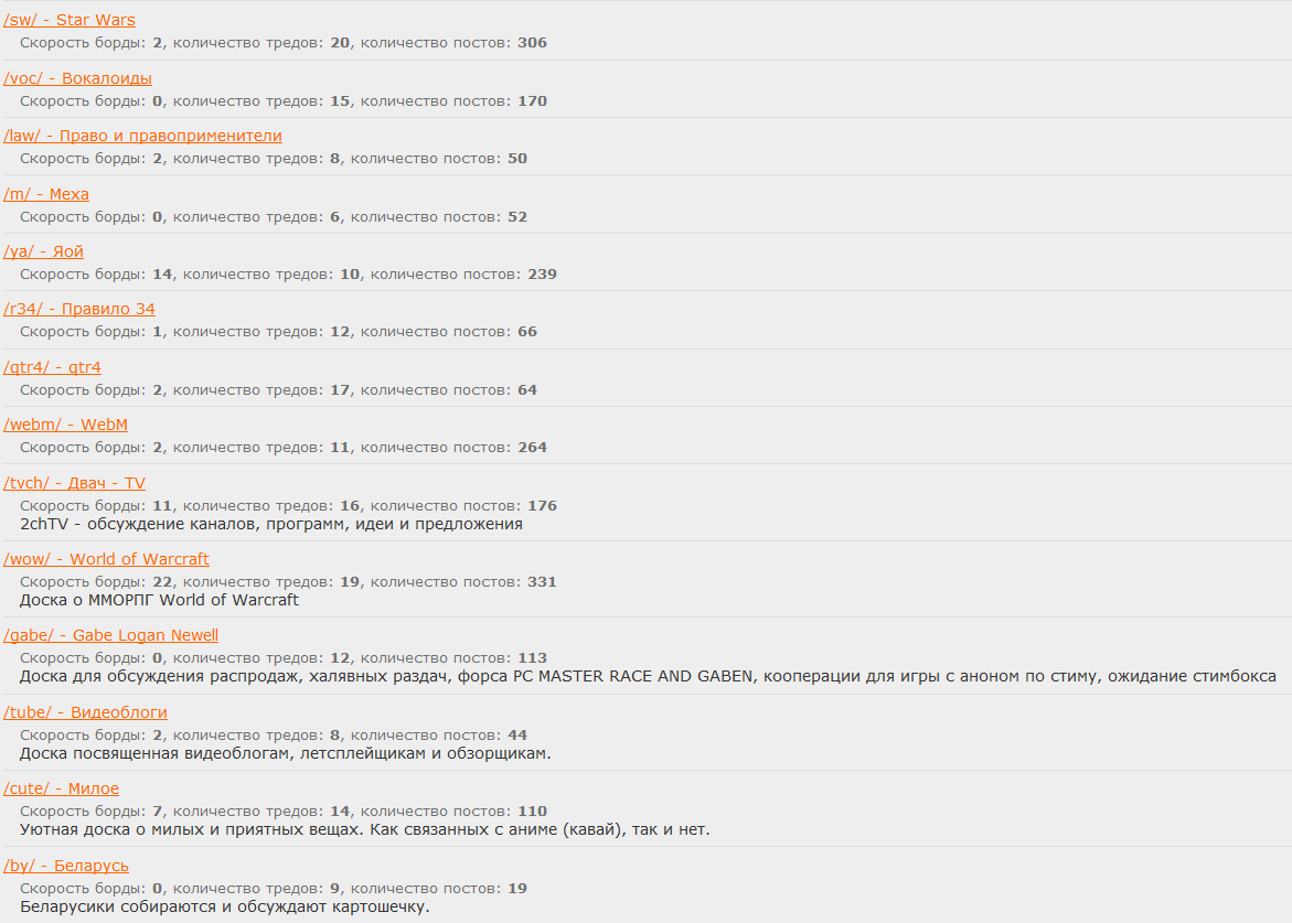 Хотите свою доску? Подайте заявку! /sw/ - Star Wars Скорость борды: 0, количество тредов: 11 /voc/ - Вокалоиды Скорость борды: 0, количество тредов: 9 /law/ - Право и правоприменители Скорость борды: 0, количество тредов: 4 /m/ - Меха Скорость борды: 0, количество тредов: 2 /ya/ - Яой Скорость борды: 1, количество тредов: 4 /r34/ - Правило 34 Скорость борды: 0, количество тредов: 6 /qtr4/ - qtr4 Скорость борды: 0, количество тредов: 3 /webm/ - WebM Скорость борды: 0, количество тредов: 3