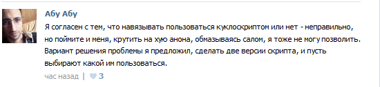 Обезьяна мог бы уже просто прицепить ссылку на скрипт в шапке, потому что после такого ажиотажа его даже дебилы из социальной сети поставят. Обосрался так обосрался.