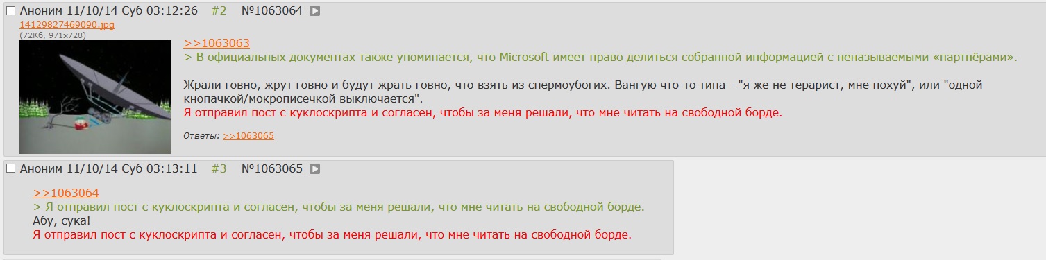 Лол, сколько лицемерных хуесосов. То есть тонны "Рашка-парашка тредов", гомосолдаты и прочая политическая или околополитическая хуйня в /b - это норма, это ни разу не пропаганда, все нормально. Как только появляется всего один постоянный тред с несколько иной точкой зрения, все тут же верещат, что там одни пятнадцатирублевые. Но вот что интересно, ведь пятнадцатирублевые могли бы также требовать у Абу выпил рашка-парашка тредов и прочих, обвиняя всех их посетителей в проплаченности. Но они этого не делают. То есть, внезапно, у тех кто больше всех орет о свободе слова градус тоталитаризма гораздо выше чем у тех, кто по их мнению и есть тоталитарий, проплаченный и агент Кремля. Забавная хуйня.