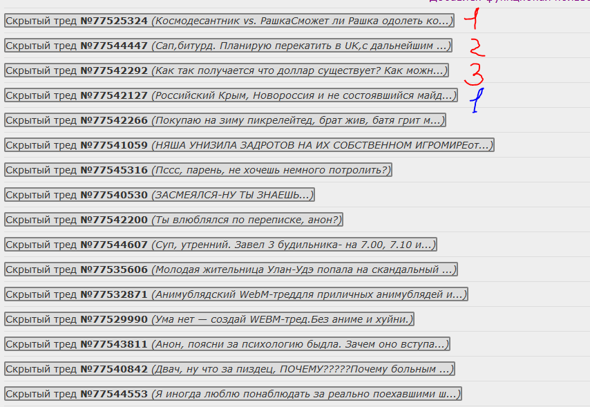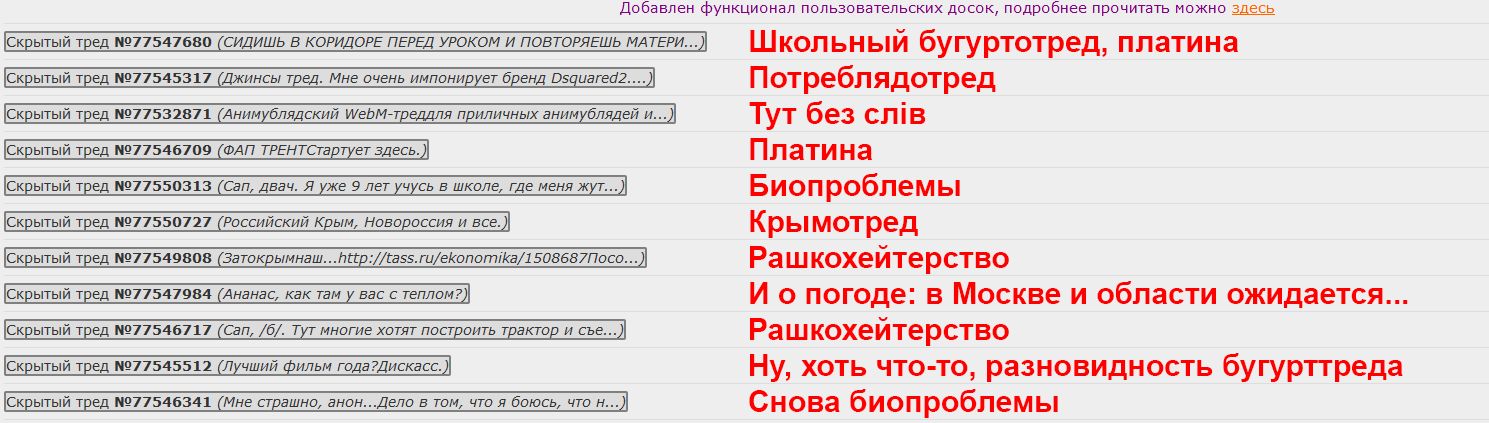Если бы куклопетушок добавил в скрипт настройку «скрывать крымотреды», было бы замечательно. Была бы полезной ещё настройка «скрывать анимутреды», «скрывать рулетка-треды», «скрывать ЕОТ-треды» etc.
