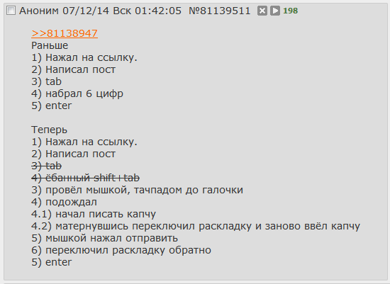 Репост из /b/ По Enter раньше посты отправлялись, а сейчас надо мышкой кнопку жать. Абу, сука, умри в муках. Ещё и заново надо вводить постоянно, то истекает, то тупо сама пропадает.