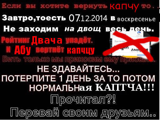 Кто-нибудь донесите до Аба простую блять мысль, что борда русскоязычная, а капча англоязычная. Переключать раскладку туда-сюда заебешься нахуй. Пусть сделает кириллическую или цифровую. Сука элементарно же - англоговорящим-то не надо раскладку дрочить, на чем пишут, на том и капча. И кривобуковки им легче разбирать - они им родные.
