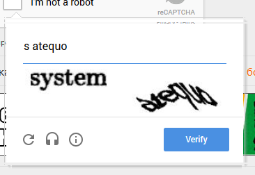 >>34858 Обеьяна сука твоя капча просит ввести хуй различимую глазоломанную хуйню, нажать мышью verify, скопипастить какой-то код и ставить его в нижнее окно. Ну охуеть вообще.