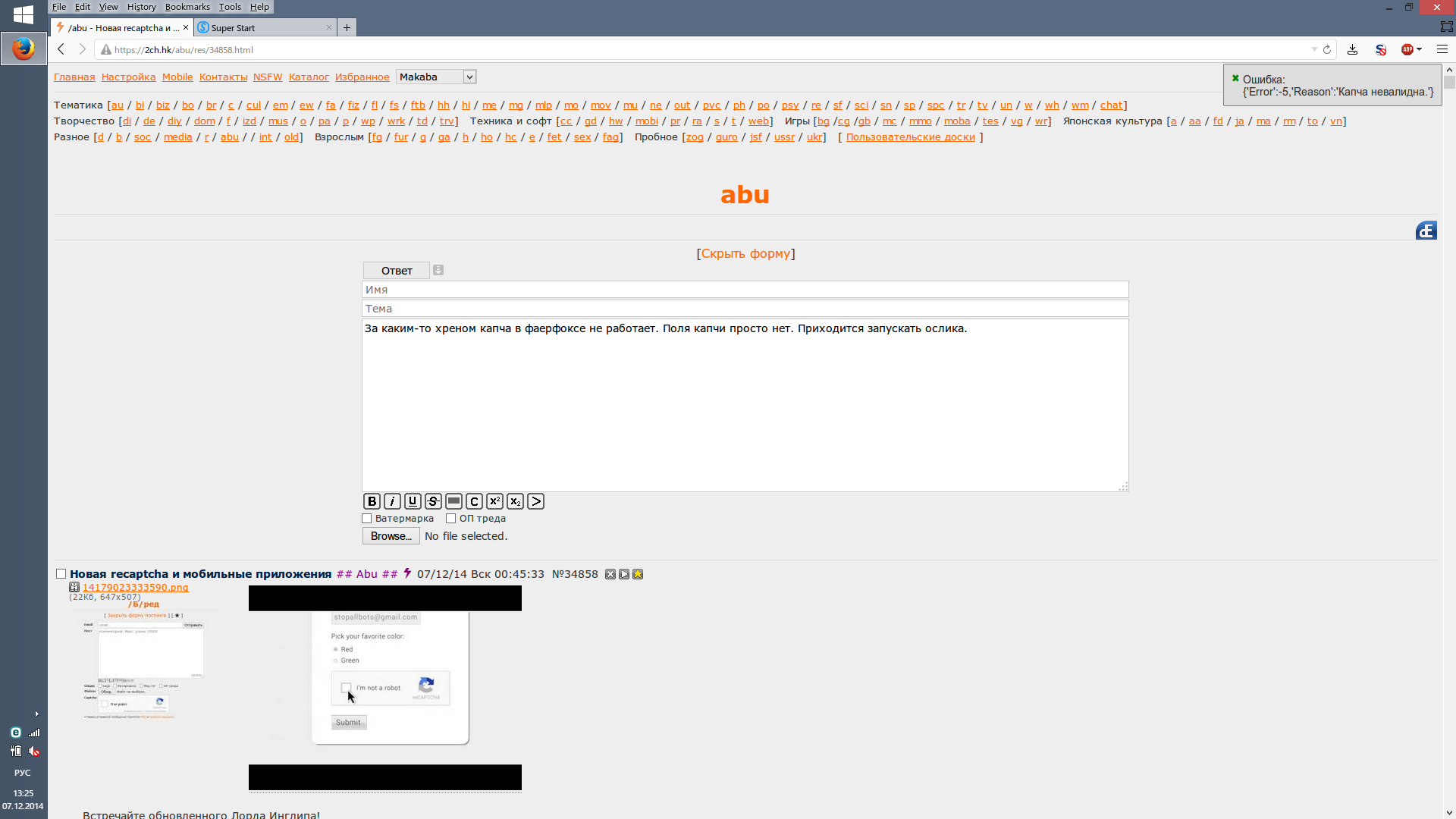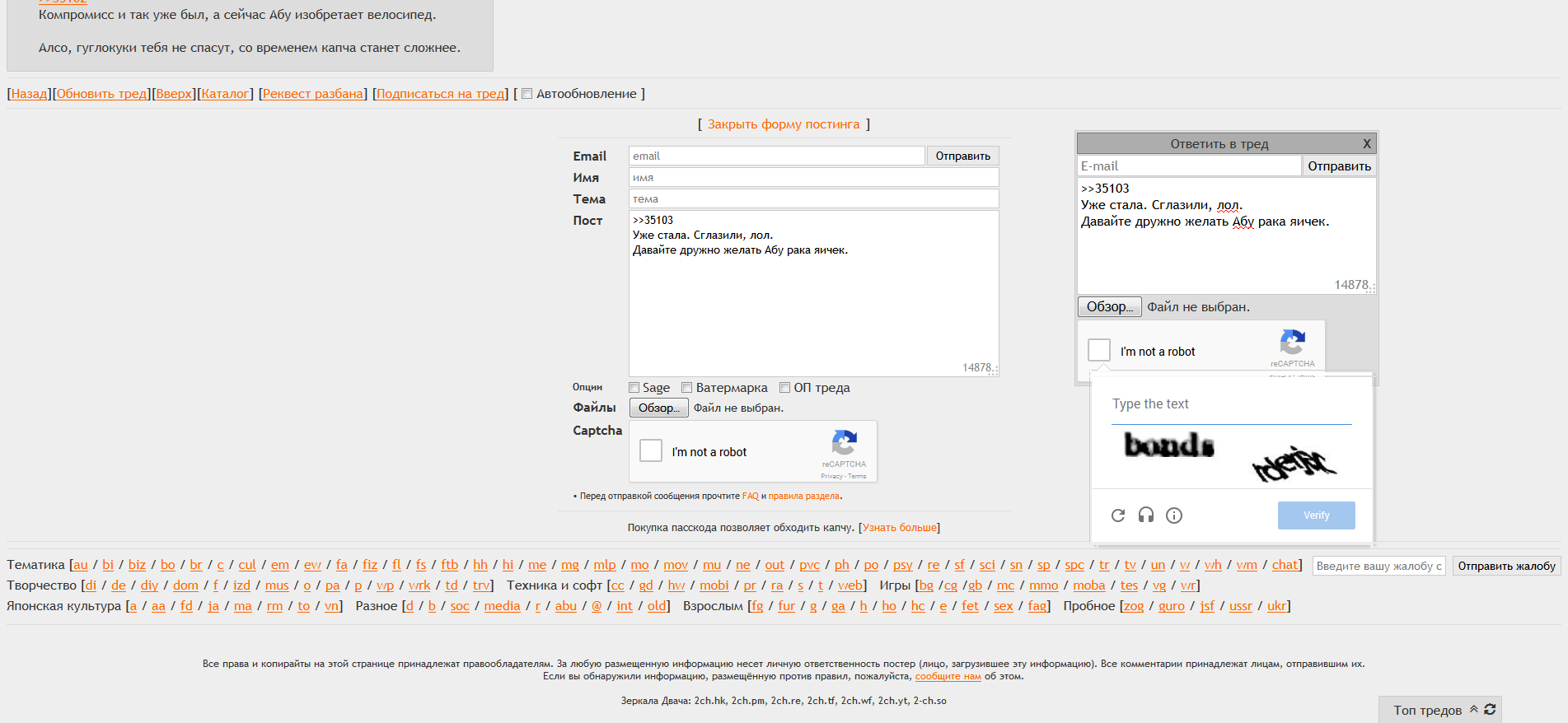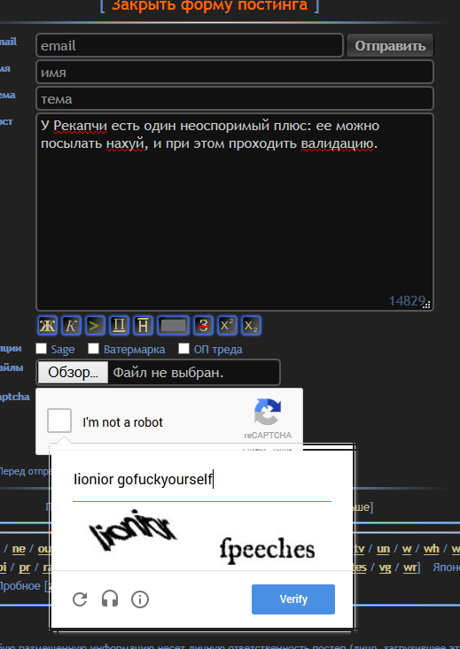 >>34858 Репост из /d/ 1.Выросло количество действий, сначала тыкаешь на "я не робот", потом переключаешь раскладку на клавиатуре(верни цифры), это долго. 2.Это очень плохая, неудобочитаемая капча. С первого раза ее не всегда удается прочесть. Приходиться обновлять. Долго. 3.Я вбил капчу, и начал писать пост, через какое-то время на экране появилась красная надпись, "сессия разорвана, пожалуйста введите капчу снова", и ТРЕД НАХУЙ ЗАКРЫЛСЯ. Это пиздец, какой то.
