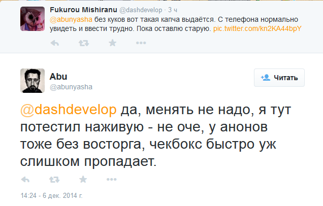 Сука, такая хуёвая капча это просто пиздец, 7 из 10 не читаемы. Чекбокс вообще пушка, вот нахуй? Плюс теперь мне раскладку надо переключать, ну были же цифры, заебись же было, нет хочу говно. Ты ебанутый?