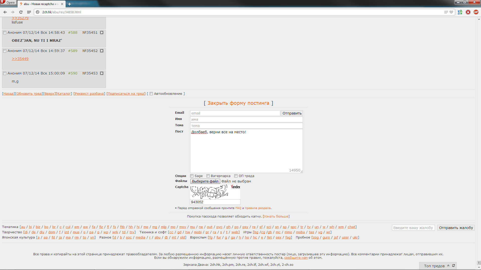 Абу извини но ты сотворил полную хуйню с капчей. На ноуте с ХР и оперой она не работает вообще дальше галки робот крутится кольцо и все. Капчевать с мобильных устройств у меня нет желания, уйду в реад онли. Думаю этим разгонишь адекватов совсем. Мимо-завсегдатай рублетредов