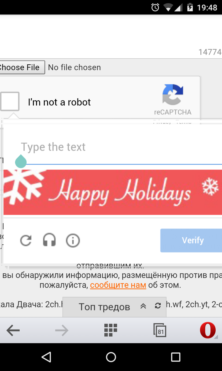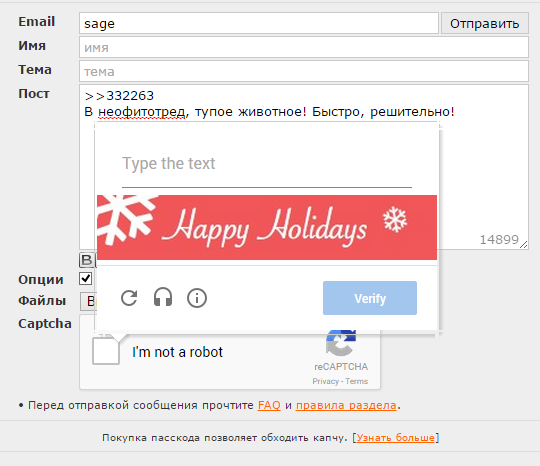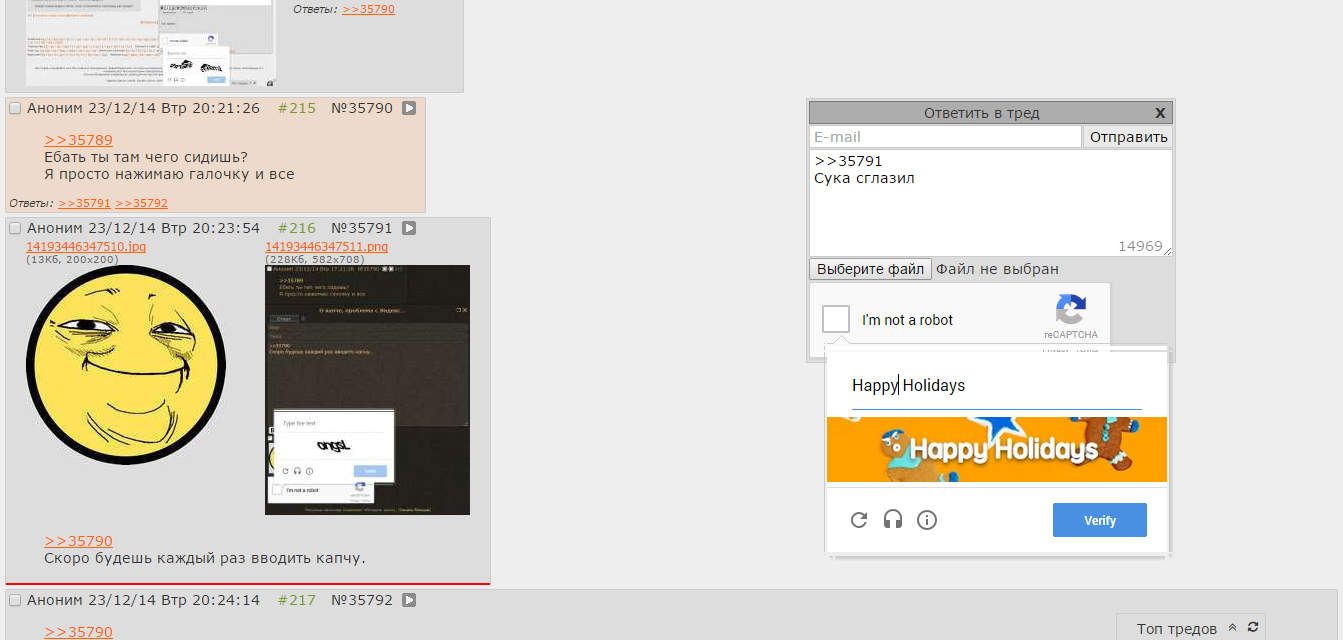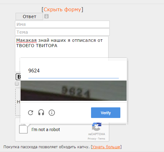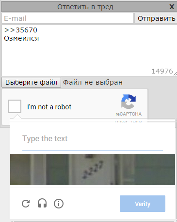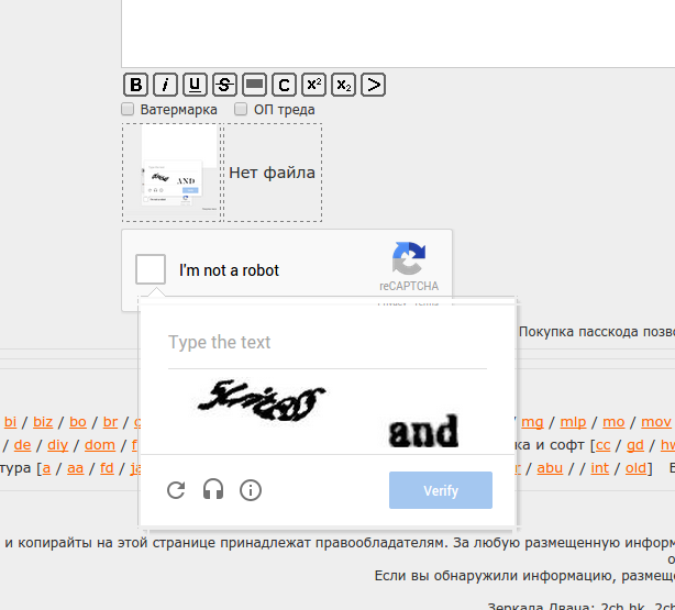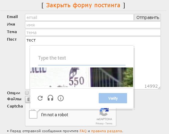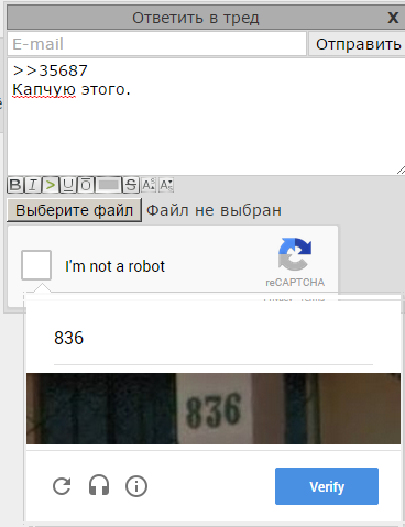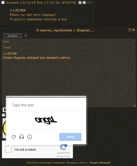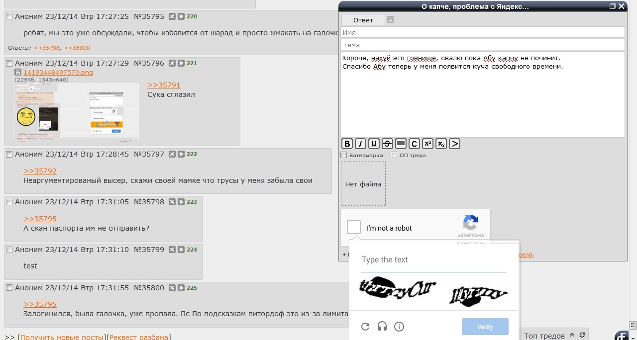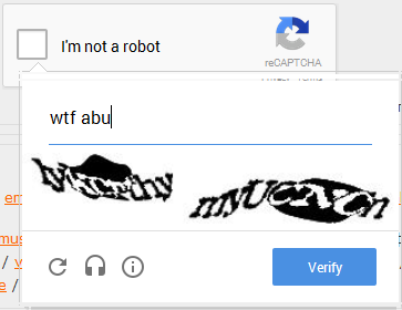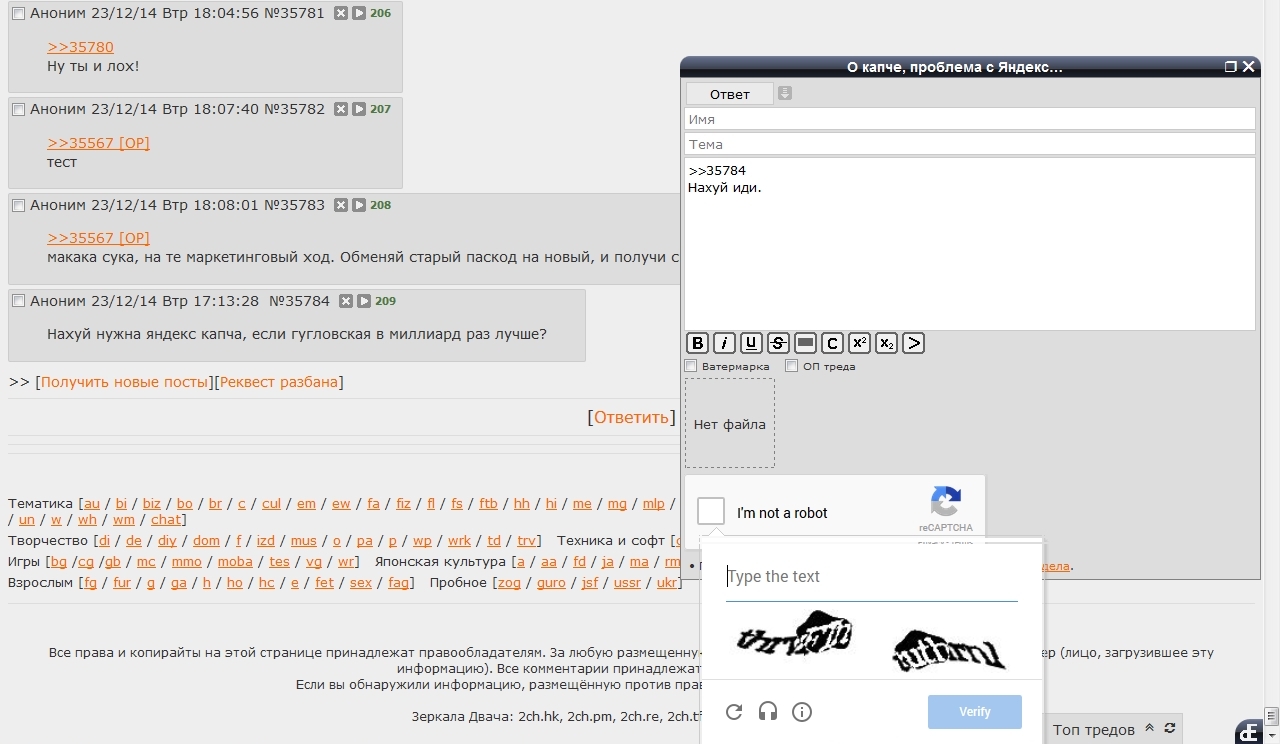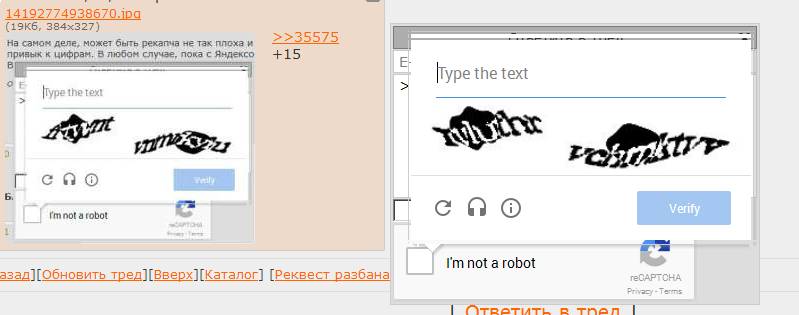 Залупа конская, а не капча. Ну можно же сделать только цифры или ввод капчи 1 раз за заход. Но нет, нихуя, ебитесь с этим говном. Стал постить примерно в 20-30 раз меньше просто потому что я ебал эту капчу в рот. С Яндекс капчей вообще отлично - жмякнул таб, на нам.блоке набрал цифры, а тут приходится опять хвататься за мышку кликать, что я не робот, потом переключать язык, потом опять браться за мышку, чтобы отправить пост. А эта ебаная двойная капча, я вот, например, не робот, но ввожу ее с 10-го раза. Говно ты ебаное, абу.