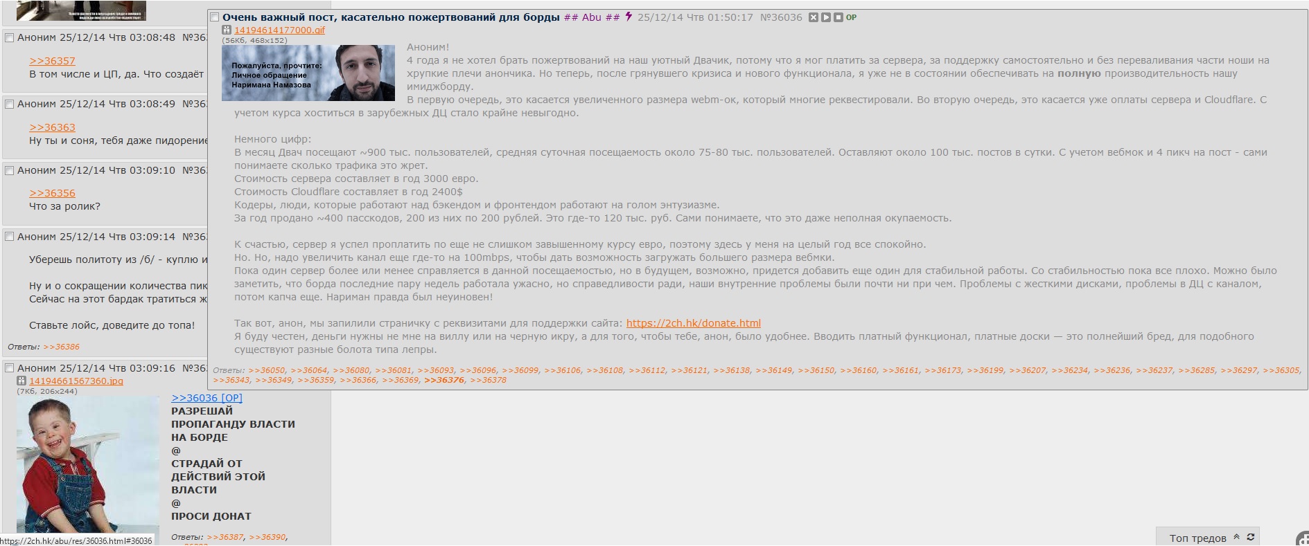 Аноним! 4 года я не хотел брать пожертвований на наш уютный Двачик, потому что я мог платить за сервера, за поддержку самостоятельно и без переваливания части ноши на хрупкие плечи анончика. Но теперь, после грянувшего кризиса и нового функционала, я уже не в состоянии обеспечивать на полную производительность нашу имиджборду. В первую очередь, это касается увеличенного размера webm-ок, который многие реквестировали. Во вторую очередь, это касается уже оплаты сервера и Cloudflare. С учетом курса хоститься в зарубежных ДЦ стало крайне невыгодно.