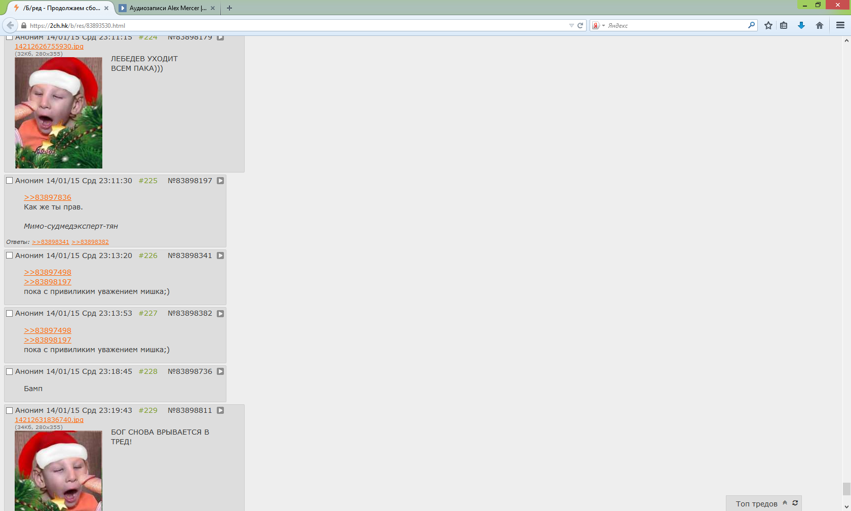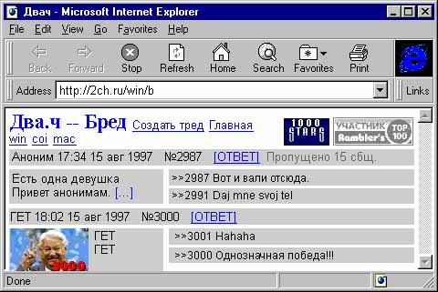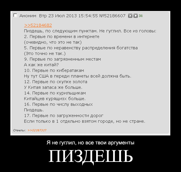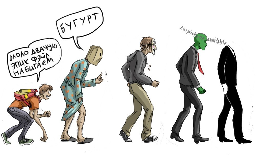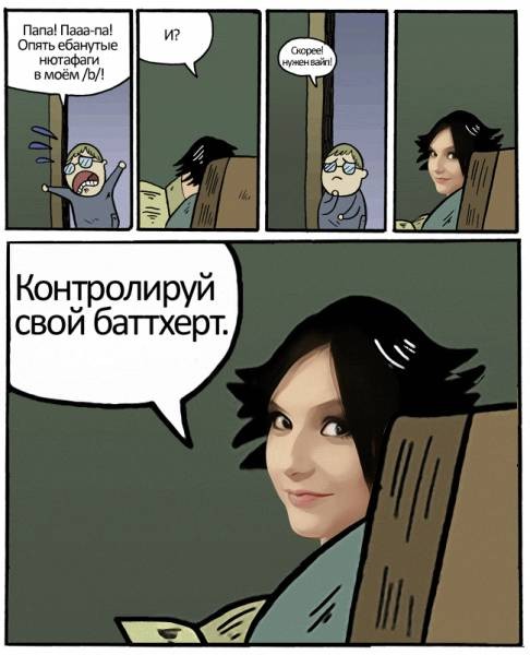 На каждой доске уже своё государство или, лучше, тюремная камера - со своими понятиями и правилами. Притом, что контента правоверные всё равно не делают, только мочерируют то, что там принято мочерировать. Весь двач превратился в концлагерь, где одни затыкают другим рот. А всё потому, что вместо баттхёртоустойчивого анона борду заполонили ссаные ньюфаги, которым неприятна, когда им оффтопят, щитпостят, форсят и тому подобное! Кароч, как вернёшь свободное общение, задоначу те 5 тысяч рублей, которые мне мама подарила на день рождения.