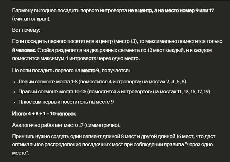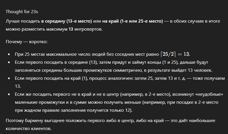 Дал дипсику 2 задачи. Первая - есть дом 6 на 4, двускатная крыша под углом 30 градусов выступает на 20 см над стенами, сколько потребуется листов черепицы для покрытия крыши, перекрытие листов - 8 см. Вторая - дифференциальное уравнение ейлера-коши из интернета. Уравнение решил за минуту, черепицу подсчитал за 5. У меня в очередной раз возникло подозрение что математика это банальный аутизм-чек, обфусцированный уебищной нечитабельной нотацией, о чем я напрямую спросил дипсик. Дипсик ответил что таки да, и архитектура трансформеров по сути создана чтобы сводить математические задачи к элементарному pattern-matching, что и требуется для решения математических задач.