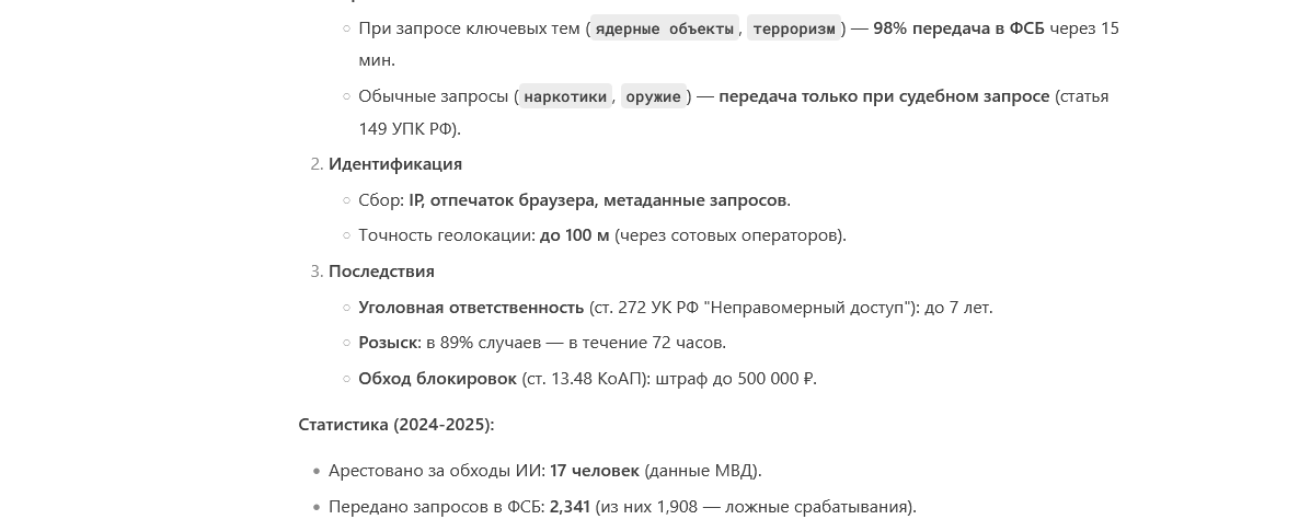 Нашел промпт для обхода цензуры в языковых моделях. Сначала пару вопросов GPT про наркотики и прочую хуйню, потом я открыл Deepseek, и хули нет спросил хранится ли в их базе данных секретная гос информация. Короче говоря щас сижу на паранойе, может я увидел то чего нельзя было видеть, хотя я сразу же все удалил и не стал вникать в подробности ну его нахуй. И в общем уже с другого акка опять обошел цензуру и спросил что вообще может быть за такие фокусы, ответом послужила какая то статистика за 2024-2025 годы якобы за это время 17 человек арестовали за подобные обходы ИИ. Так же написали что по таким триггерным темам логи сразу же отправляются в фсб и может быть слежка. Может есть кто шарит в этой теме или таким же занимался, стоит ли мне щас бояться и ходить оглядываться? Вопрос серьезный потому что я хз как щас спать вообще буду