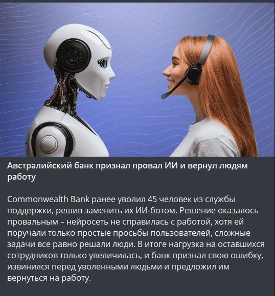 Там, где казалось, что нейронки легко заменят человека (пиздеть по скрипту, отвечая на стандартные вопросы) они не справились. Даже там! Потому что в отличии от нормального FAQ с нормальным поиском они нестабильны и нечёткие.