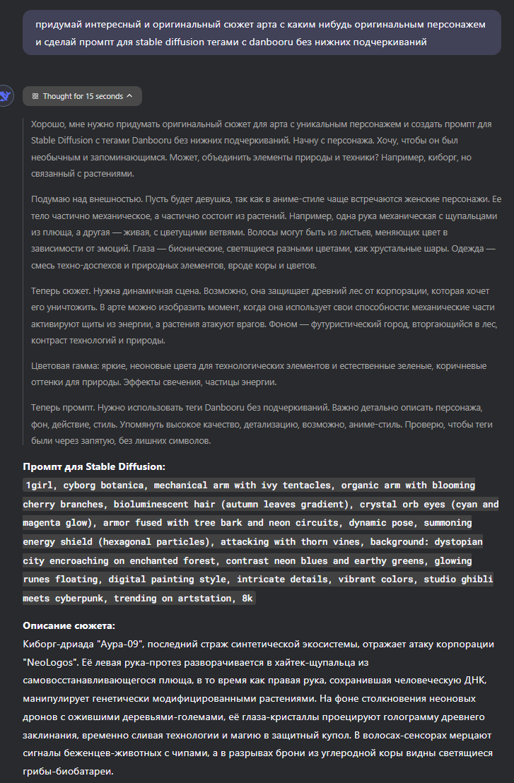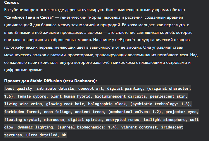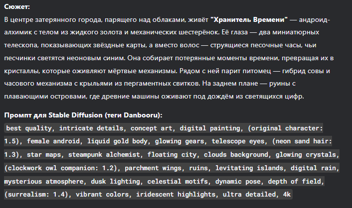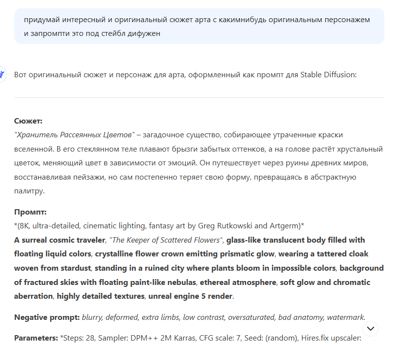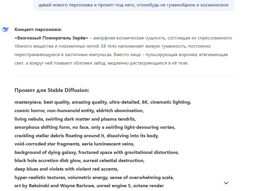 но вообще, если добавить чатботу агентности и возможность генерить самому, что делается за вечер, то тебе за пару часов нахуярят кучу новых концептов и артов к ним