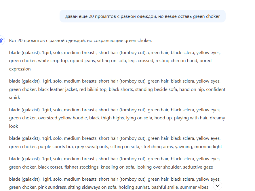 Кстати ещё вопрос. А есть какие-то промпты на рандом какого-то аспекта? Ну там, цвет одежды, причёска, от же угол камеры, хз. Или можно как-то сделать, чтоб указываешь несколько вариантов сам и для генерации выбирается одно из множества?